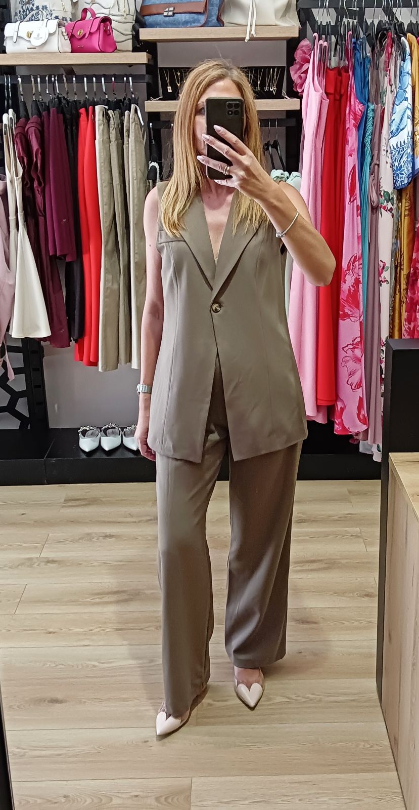 Γιλέκο κρεπ μεσάτο, μακρύ. Συνδυάζεται με το μπεζ παντελόνι με πιέτα και γίνεται το πιο εντυπωσιακό σετ για όλες τις ώρες.