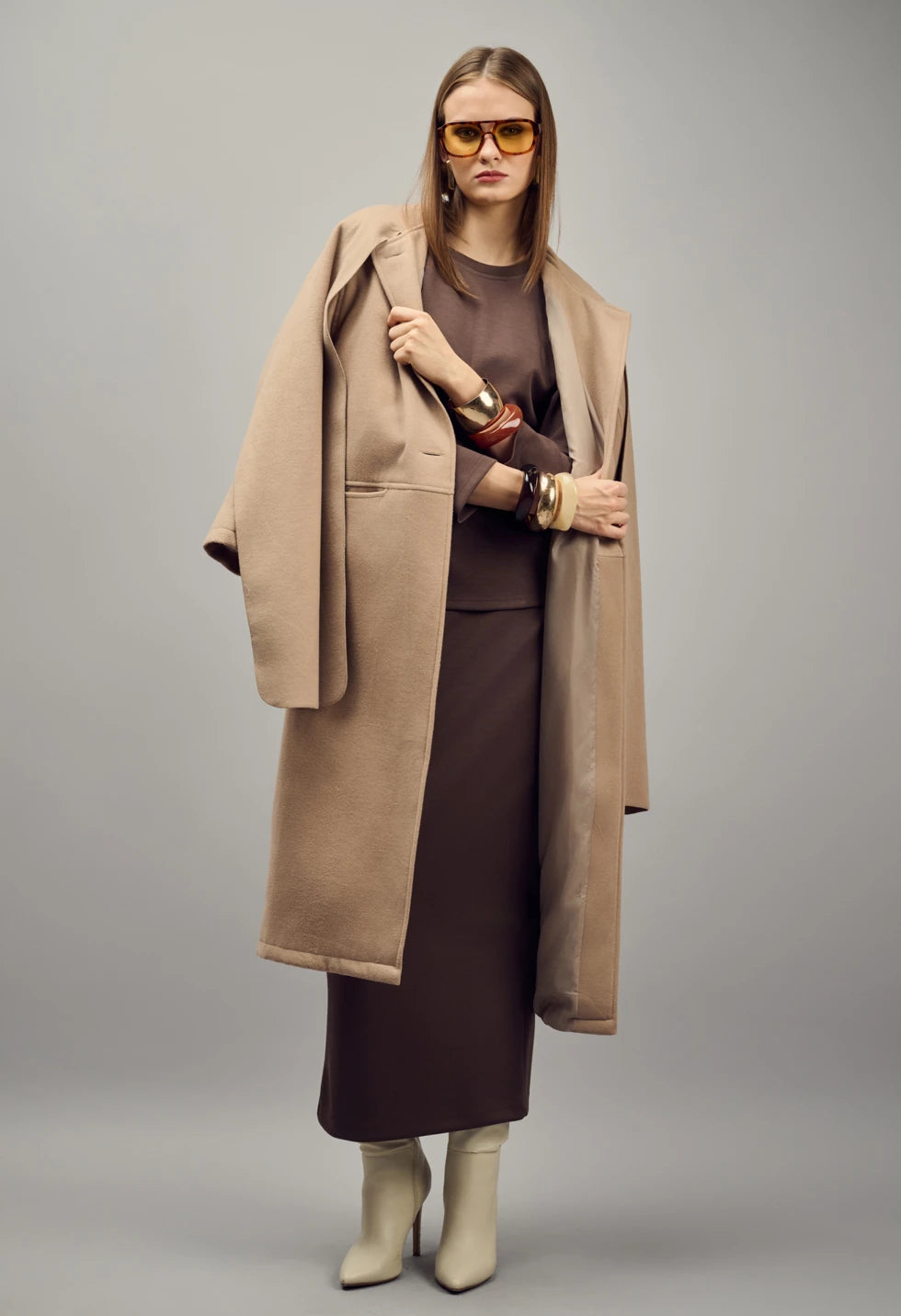 Μακρύ παλτό με ενσωματωμένο κασκόλ, oversized γραμμή με τσέπες μπροστά, μακρύ μανίκι, κλείσιμο με κουμπιά στο επάνω μέρος, φόδρα εσωτερικά, χαλαρή εφαρμογή.