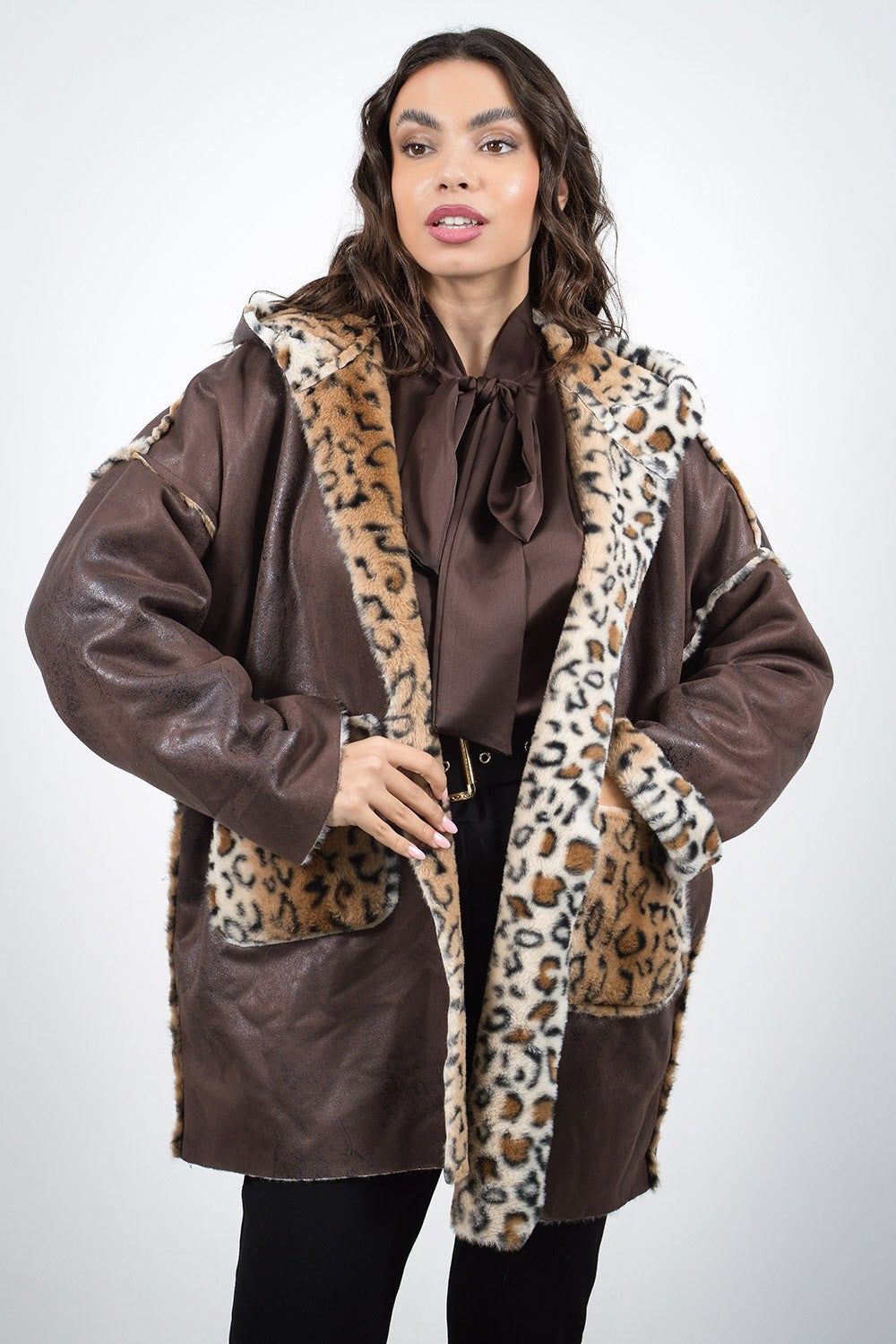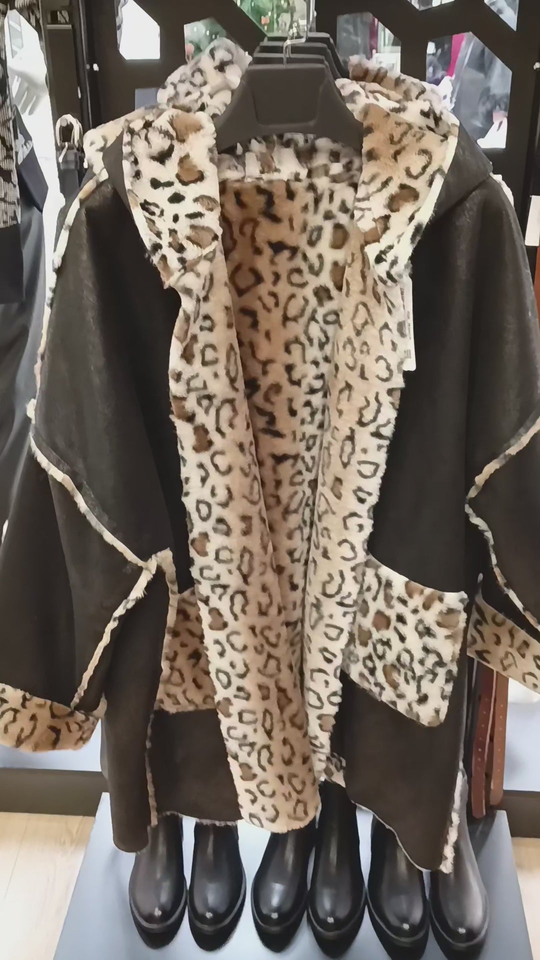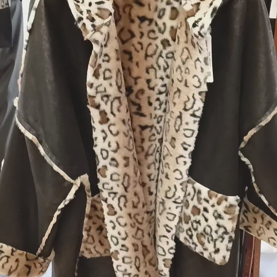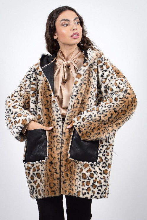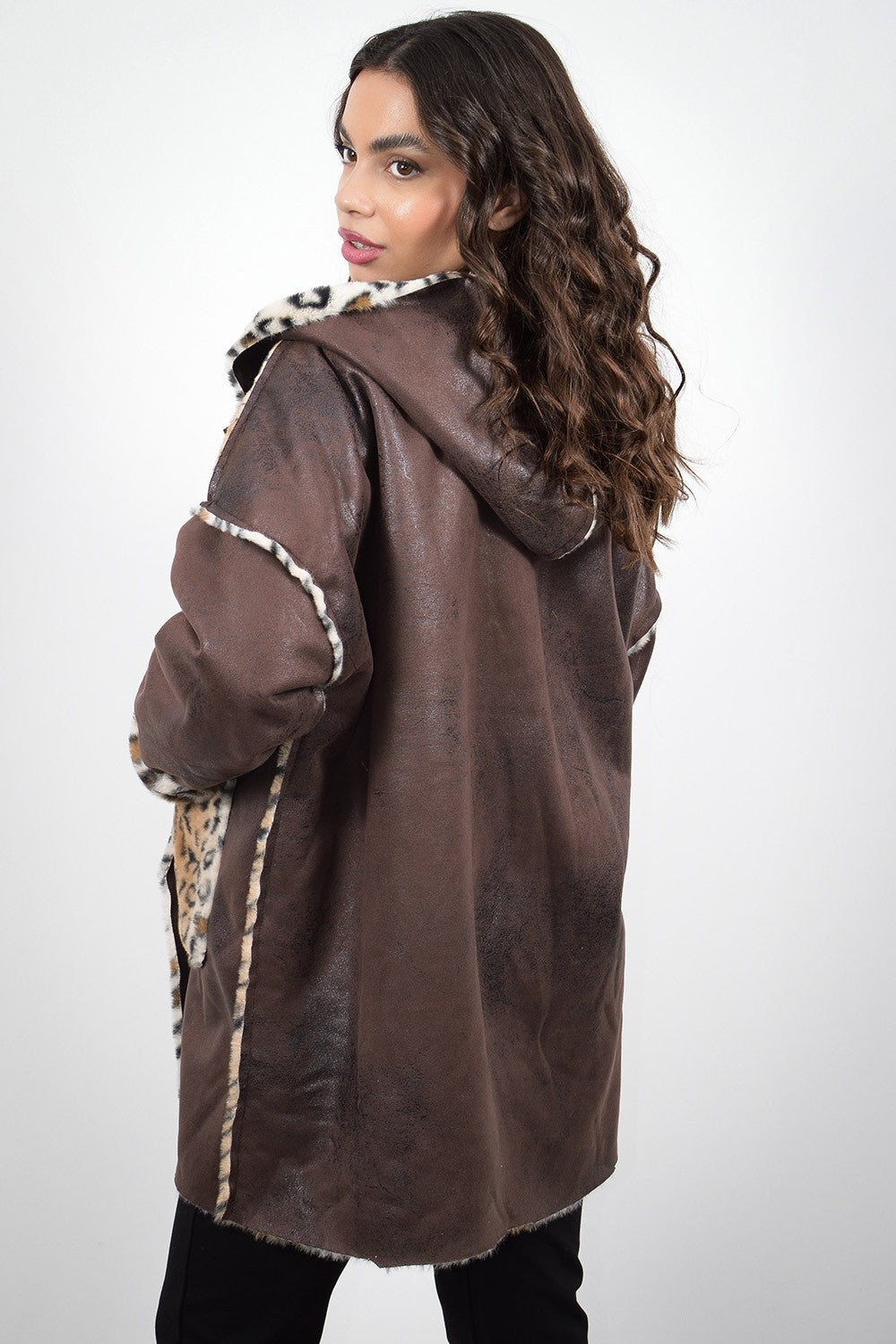 Πανωφόρι μακρύ σε καφέ και μαύρη απόχρωση μουτόν με λεοπάρ επένδυση. Είναι διπλής όψης και διαθέτει κουκούλα. Γούνινη λεπτομέρεια στις τσέπες, τα μανίκια και περιμετρικά της κουκούλας.