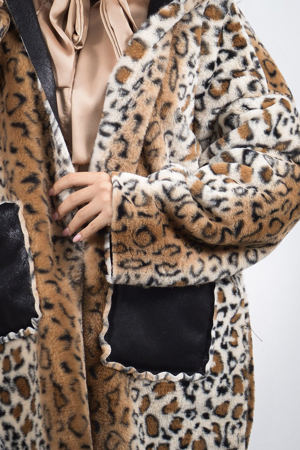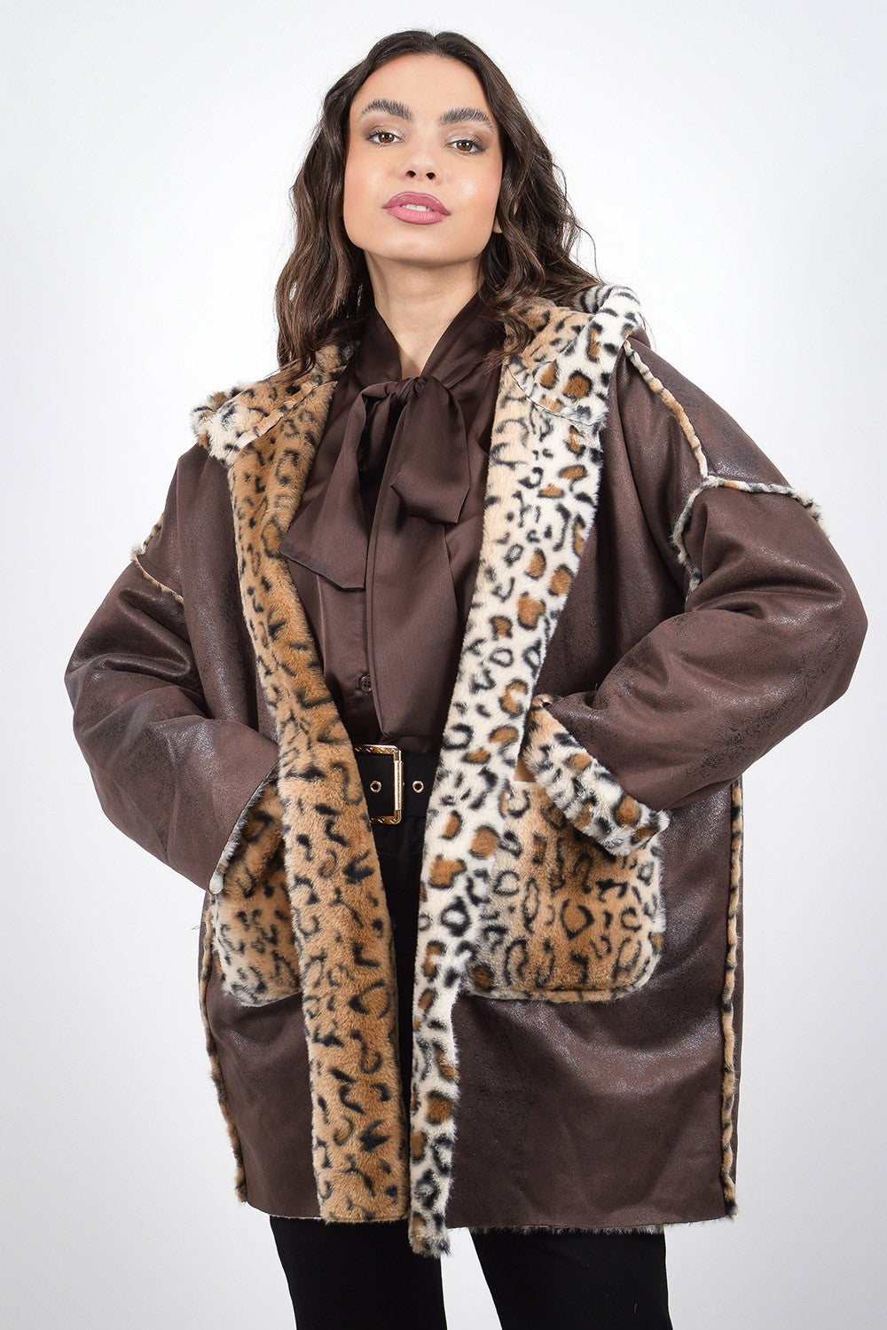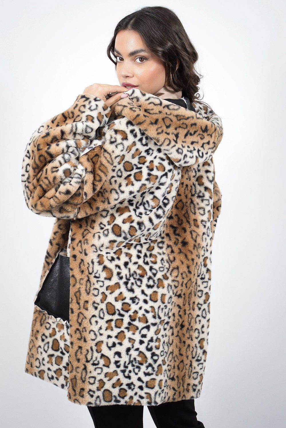 Πανωφόρι μακρύ σε καφέ και μαύρη απόχρωση μουτόν με λεοπάρ επένδυση. Είναι διπλής όψης και διαθέτει κουκούλα. Γούνινη λεπτομέρεια στις τσέπες, τα μανίκια και περιμετρικά της κουκούλας.