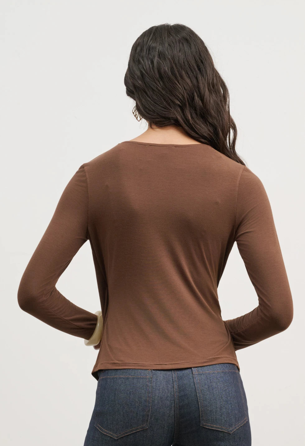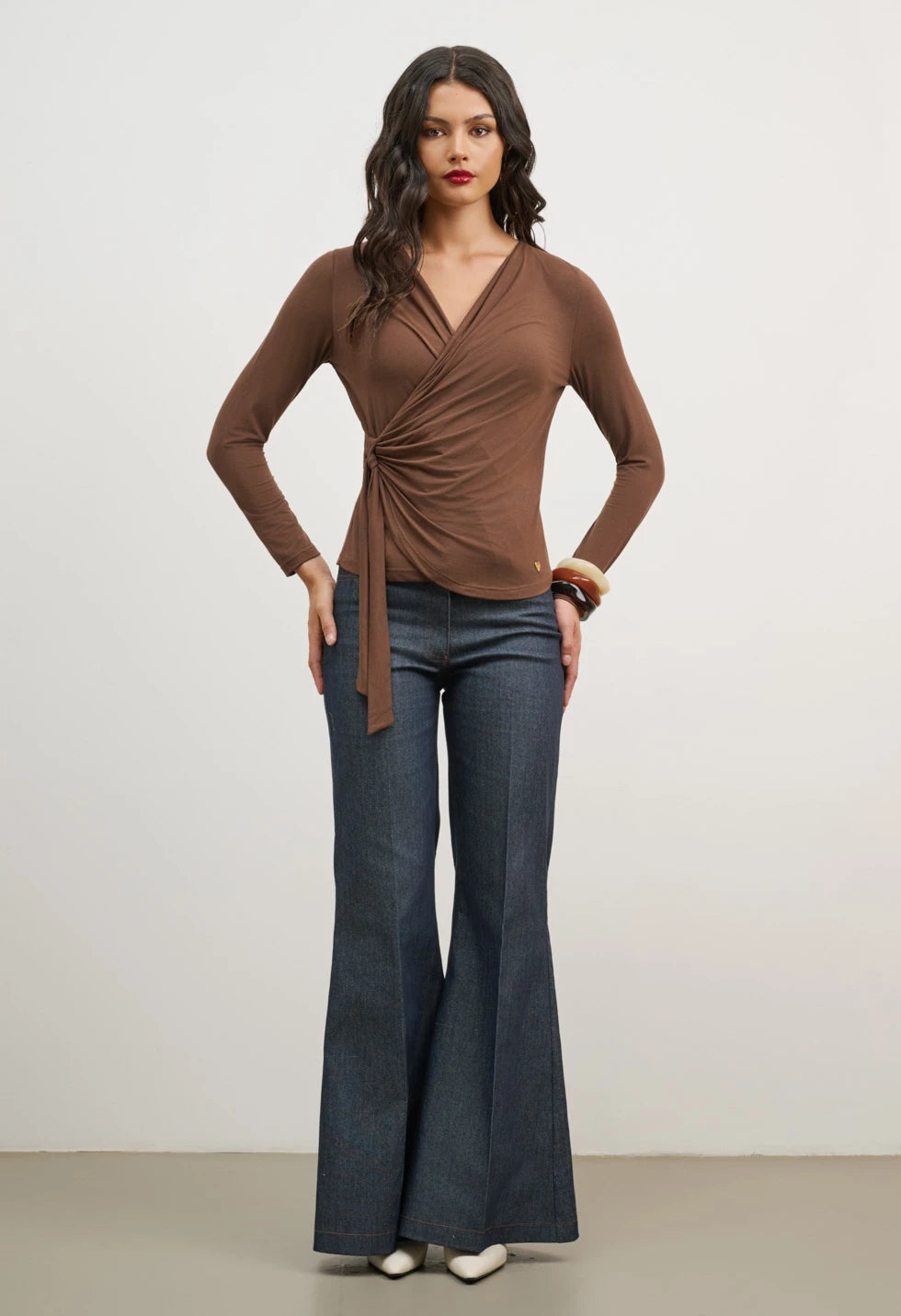 Ανακάλυψε την κομψή μπλούζα κρουαζέ με δέσιμο σε ζεστό καφέ χρώμα – ιδανική για καθημερινές εμφανίσεις ή smart casual outfits! 👗💛