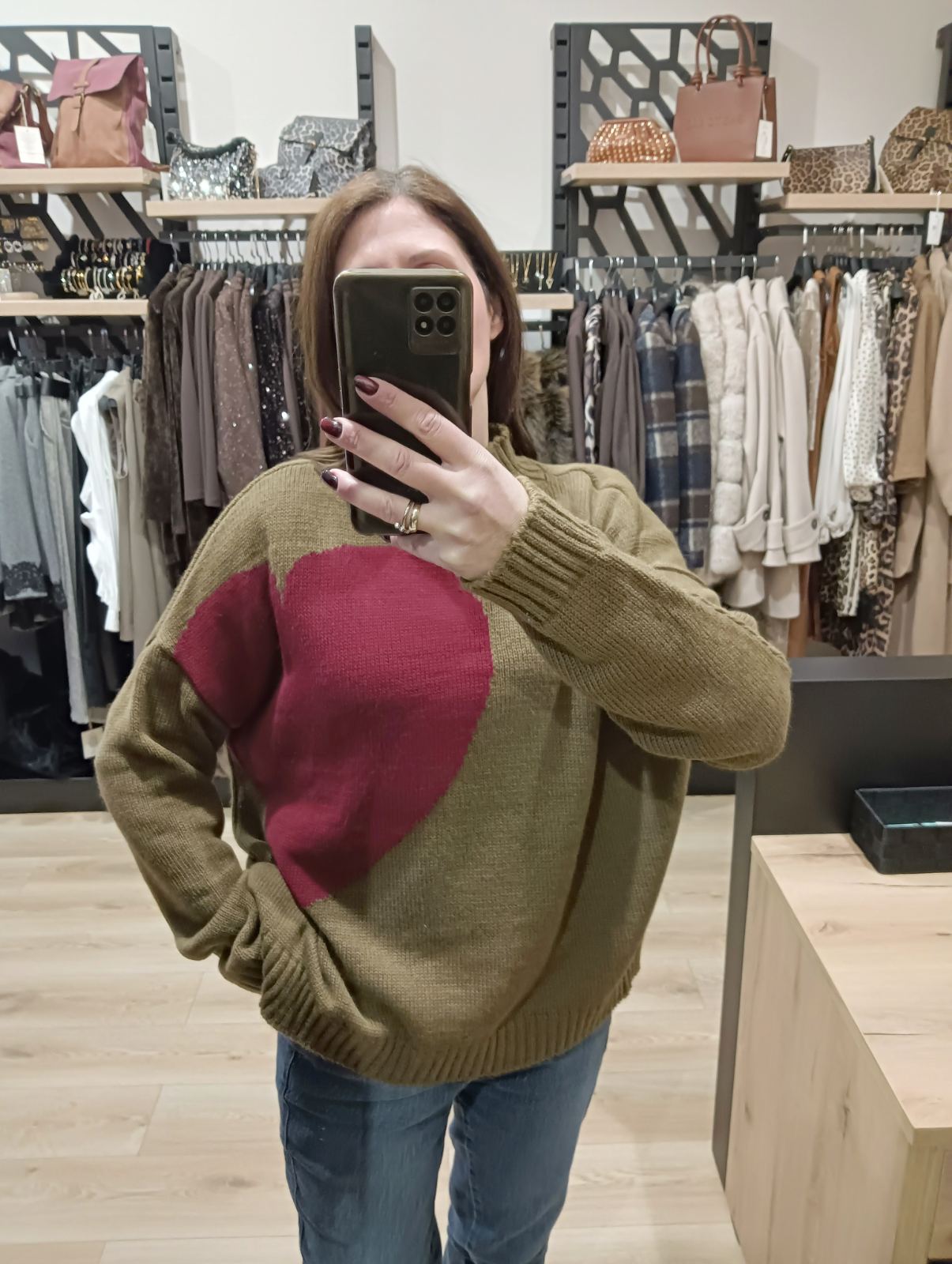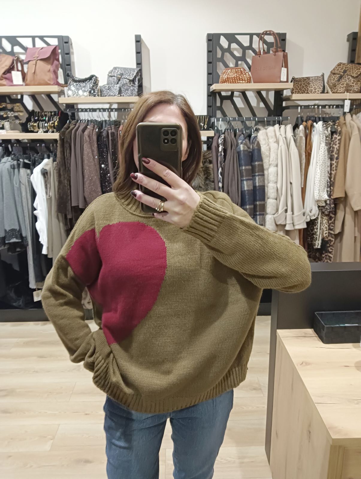 Πλεκτή μπλούζα oversize   με μπορντό καρδιά και κλειστό λαιμό ζιβάγκο.