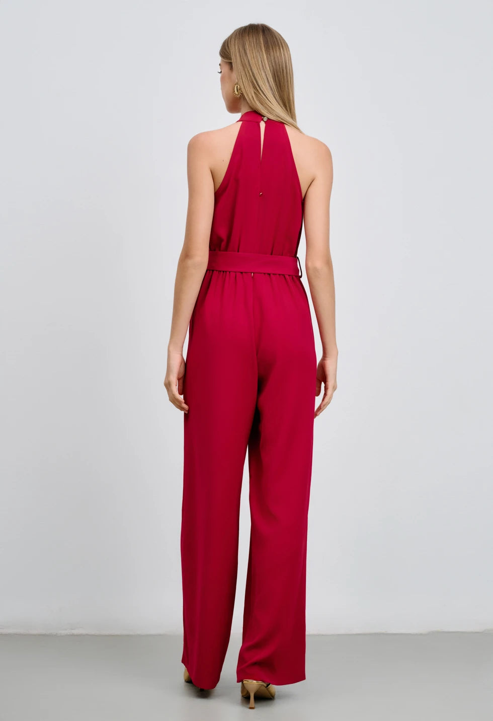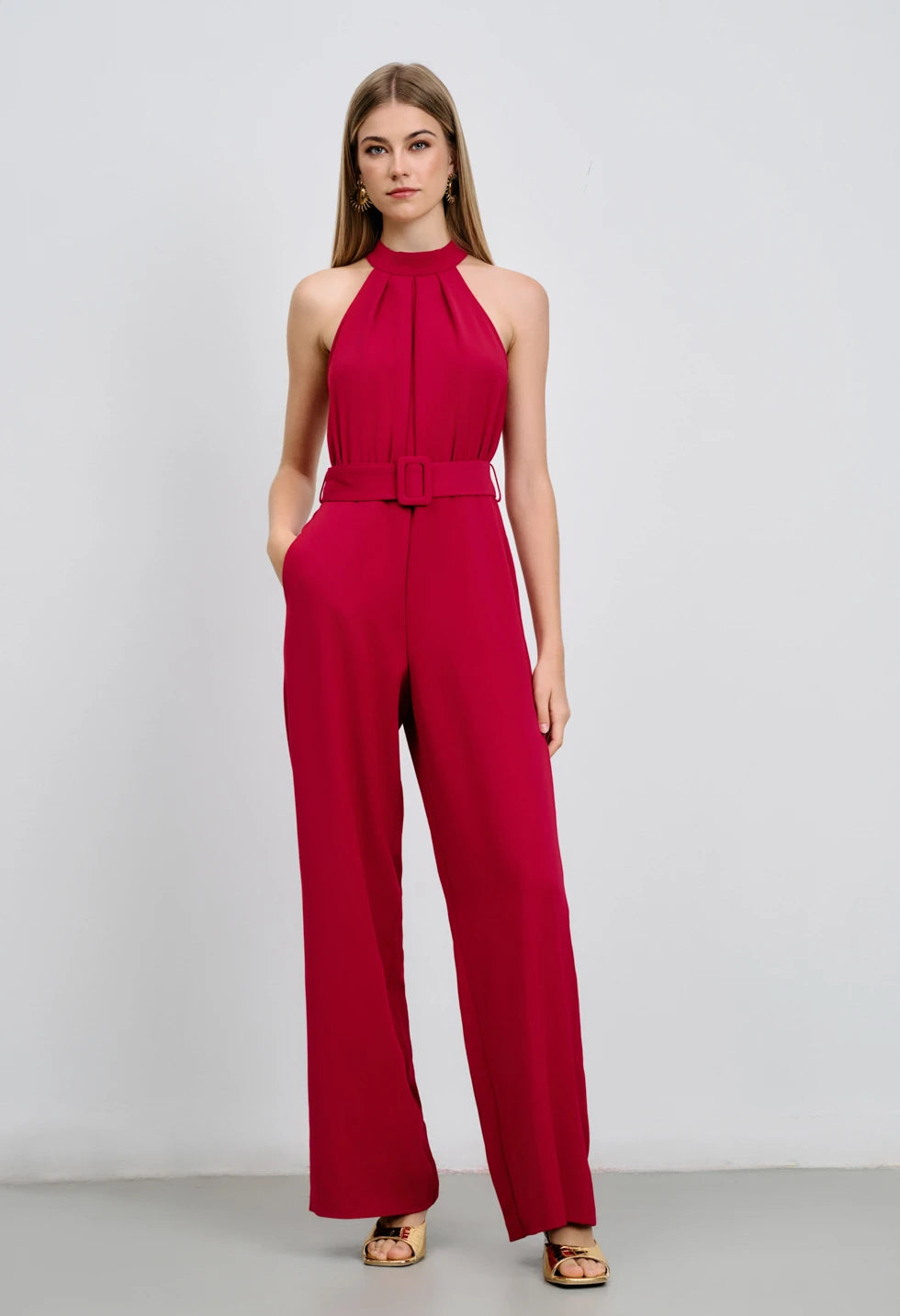Ολόσωμη φόρμα με λαιμόκοψη halter και λεπτομέρεια με πιέτες, ελαστική μέση και φοδραρισμένη ζώνη από το ίδιο ύφασμα με αγκράφα, τσέπες στο πλάι, κλείσιμο με φερμουάρ και κουμπιά στο πίσω μέρος, κανονική εφαρμογή.