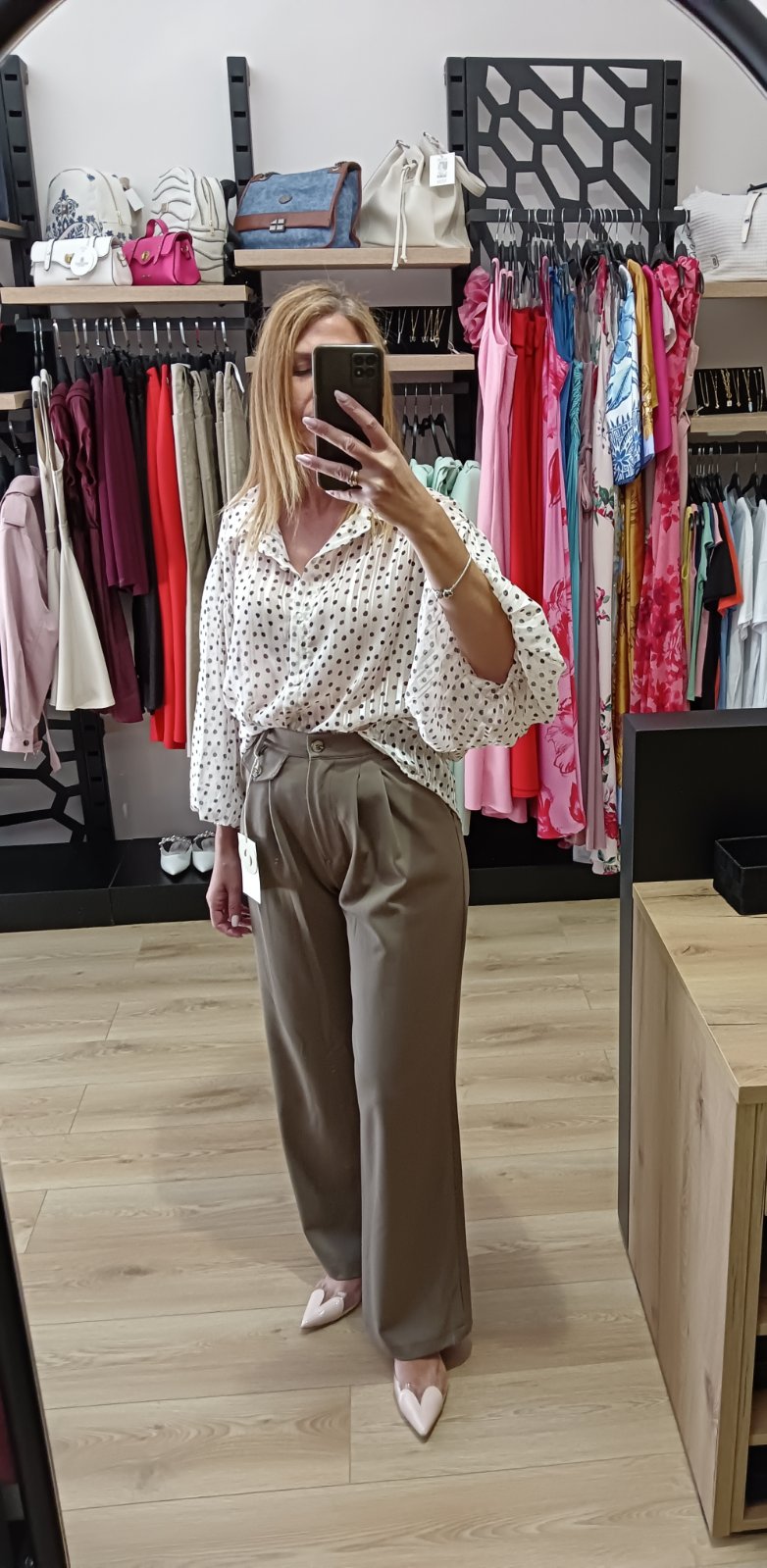Παντελόνι κρεπ σε μπεζ απόχρωση με πιέτα, ψηλόμεσο με φαρδιά γραμμή στο τελείωμα. Συνδυάζεται με το κρεπ γιλέκο και δημιουργεί το απόλυτο σετ για όλες τις ώρες.