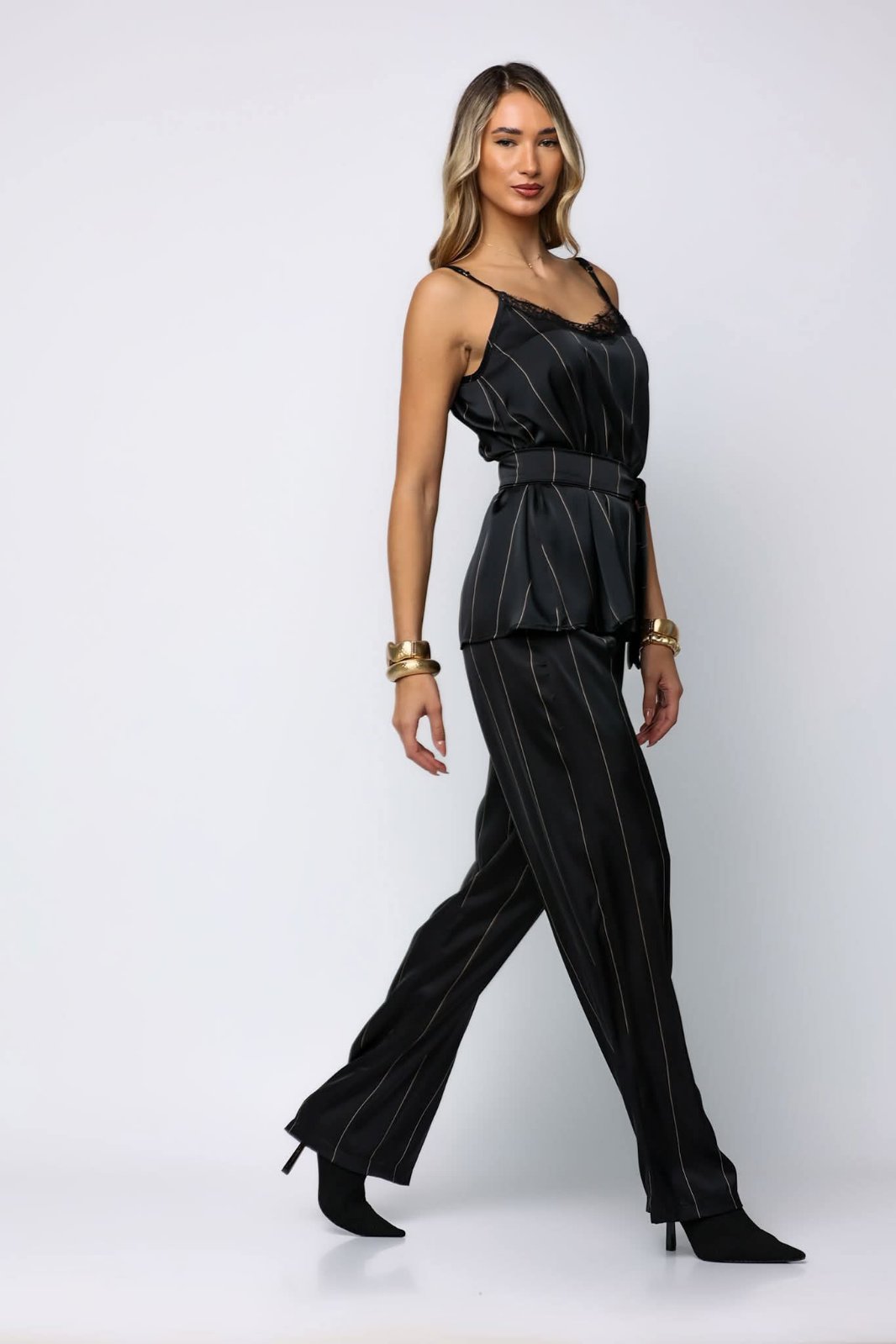 Παντελόνι σατέν μαύρο με ρίγα μπεζ , ψηλόμεσο με λάστιχο.