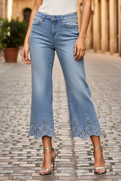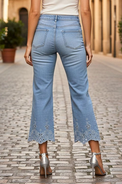 Παντελόνι τζιν κάπρι με κέντημα και στρας στο τελείωμα.