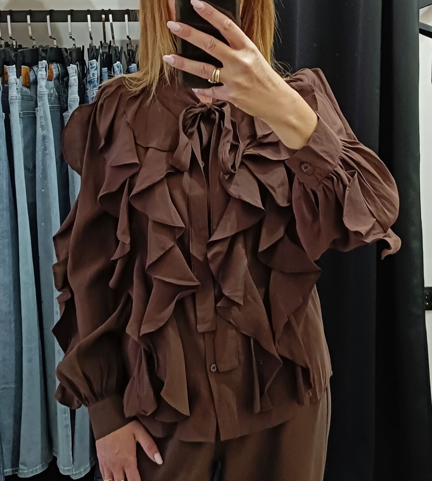 Μακρυμάνικο πουκάμισο σε καφέ απόχρωση. Το σχέδιό του ξεχωρίζει για τα μεγάλα βολάν που πέφτουν στο μπροστινό μέρος και στο μανίκι δημιουργώντας έναν εντυπωσιακό όγκο. Έχει κορδόνια που δένουν κόμπο στο λαιμό.