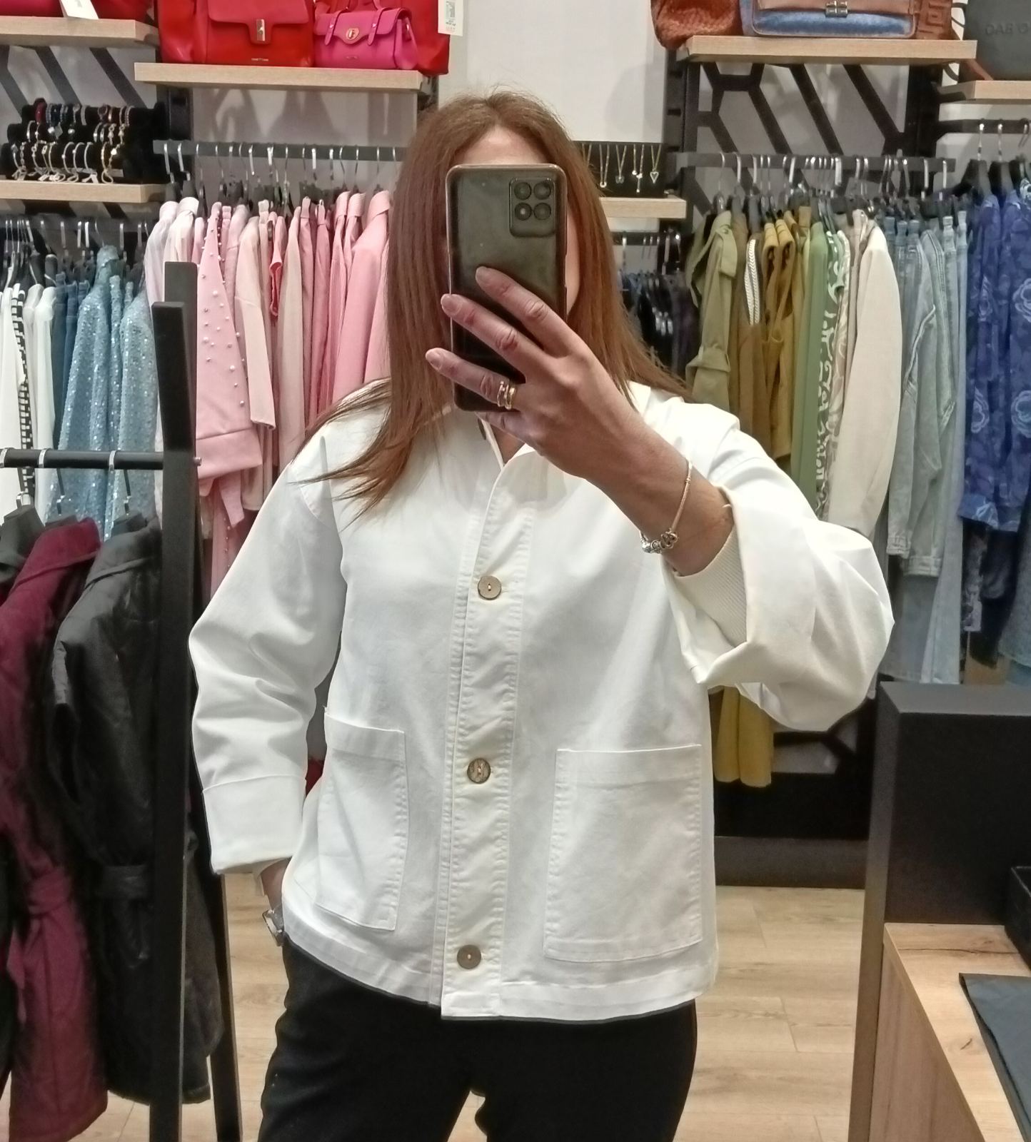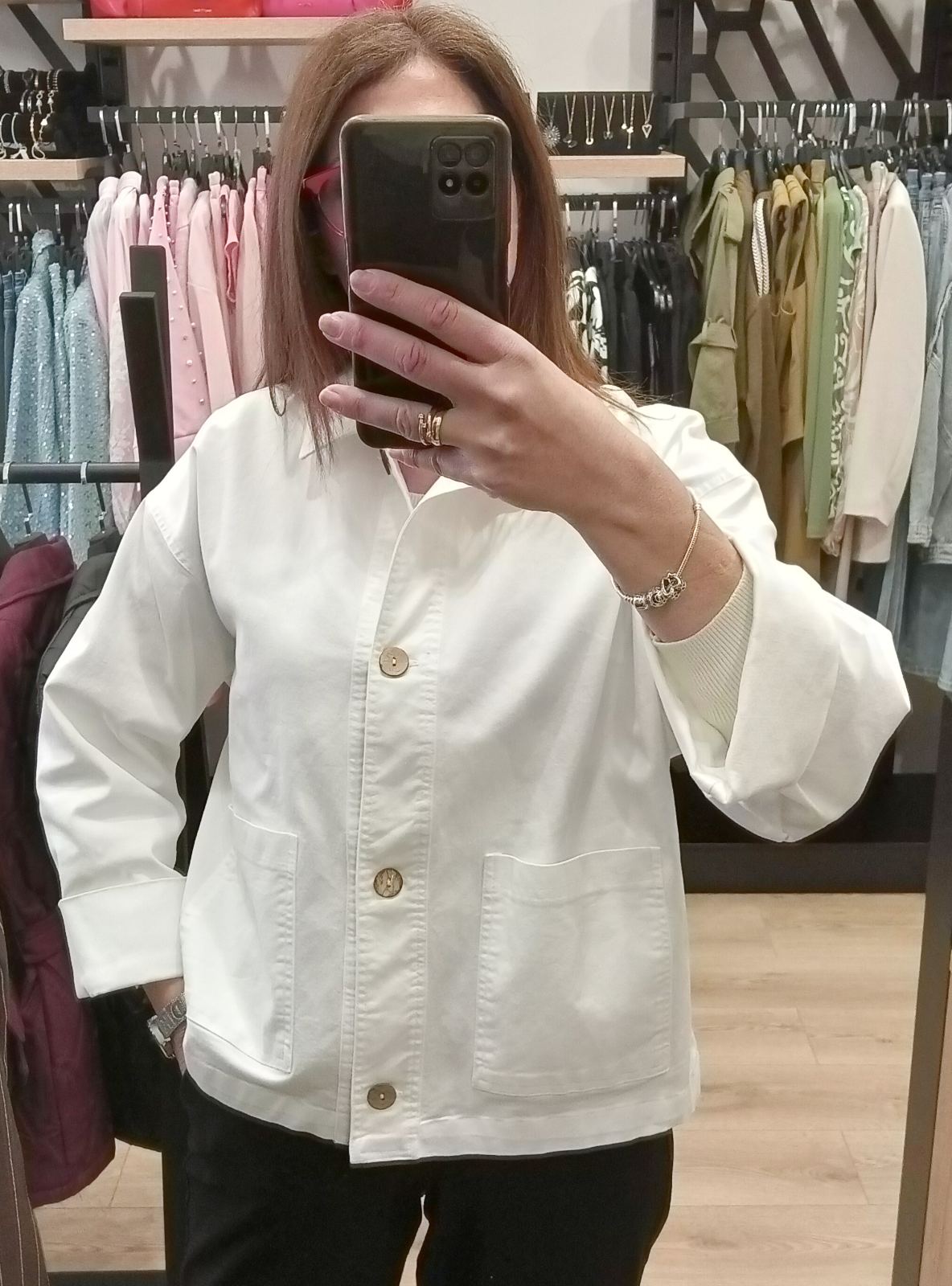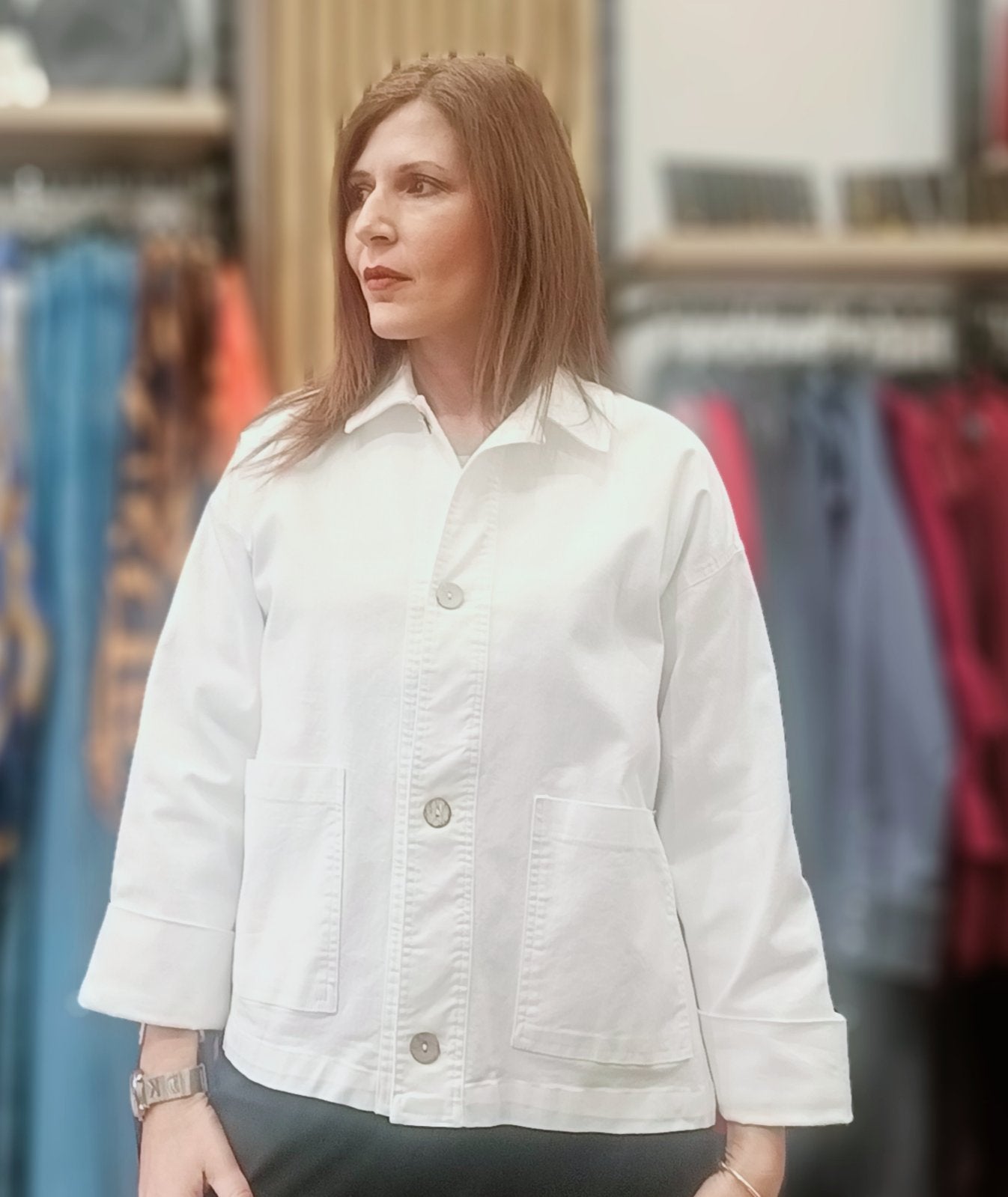 Τζιν μπουφάν λευκό oversize με κουμπιά και τσέπες στο πλάι.