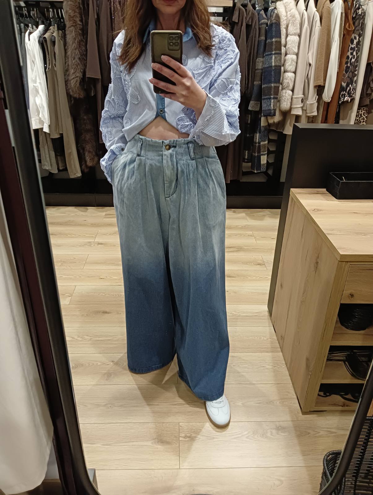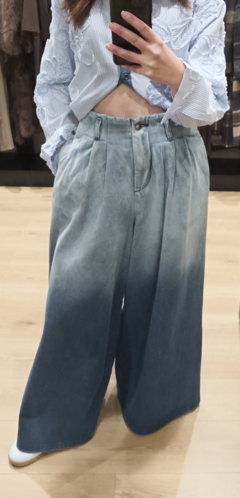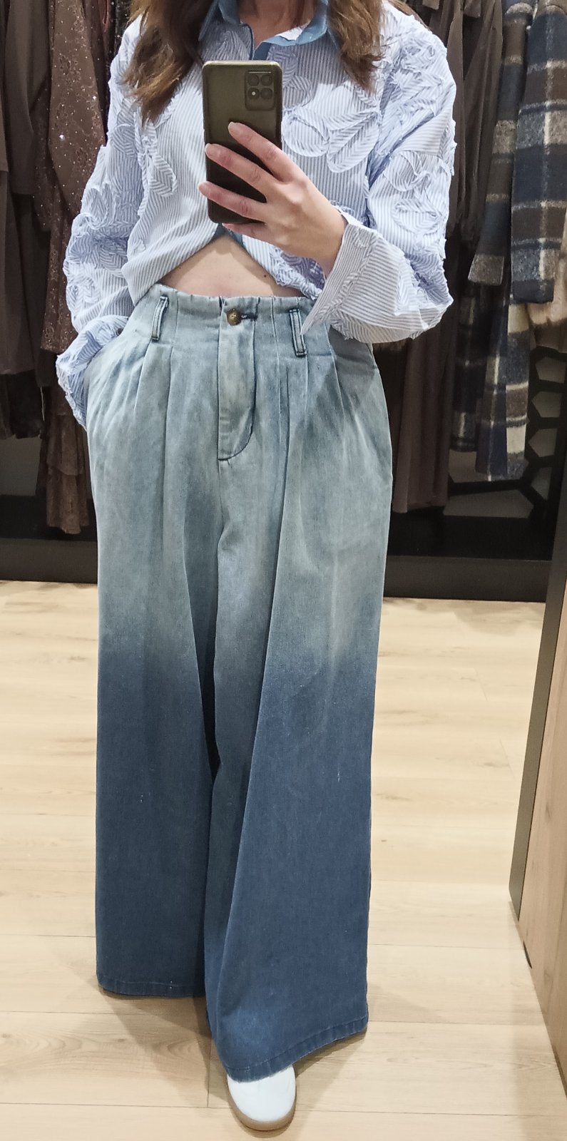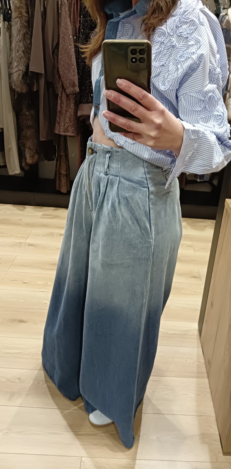 Τζιν παντελόνι φαρδύ ψηλόμεσο με πιέτες με συνδιασμό χρωμάτων.
