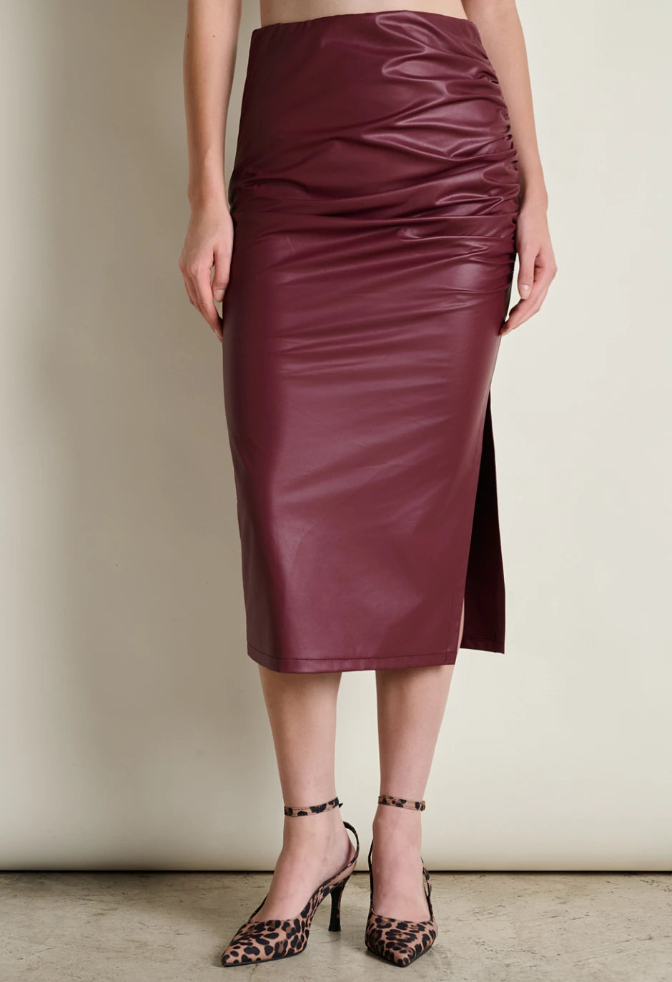 Midi φούστα σε δερματίνη, λεπτομέρεια με σούρες στο μπροστινό μέρος, σκίσιμο στο πλάι, ελαστική μέση, φόδρα στο εσωτερικό, κλείσιμο με φερμουάρ στο πλάι, κανονική εφαρμογή.