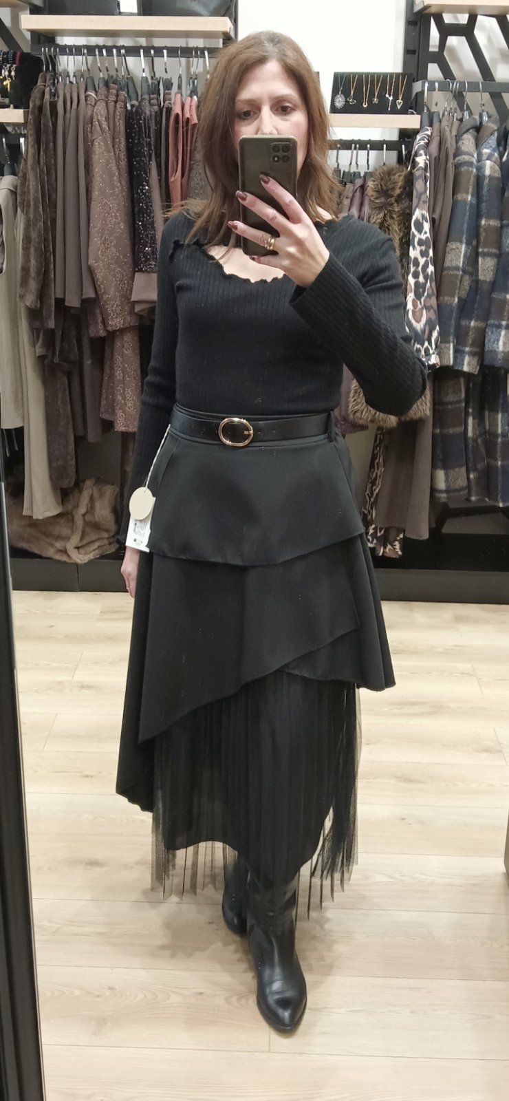 Φούστα σε μαύρη απόχρωση με βολάν, τούλινη πλισέ λεπτομέρεια στο τελείωμα και λάστιχο στη μέση. Περιλαμβάνεται η ζώνη από δερματίνη.