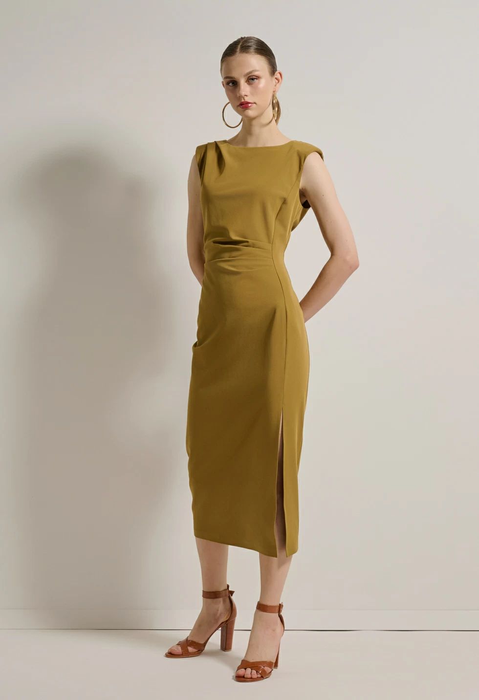 Φόρεμα αμάνικο κρεπ σε ίσια γραμμή με βάτες στους ώμους και πιέτες στη μέση.