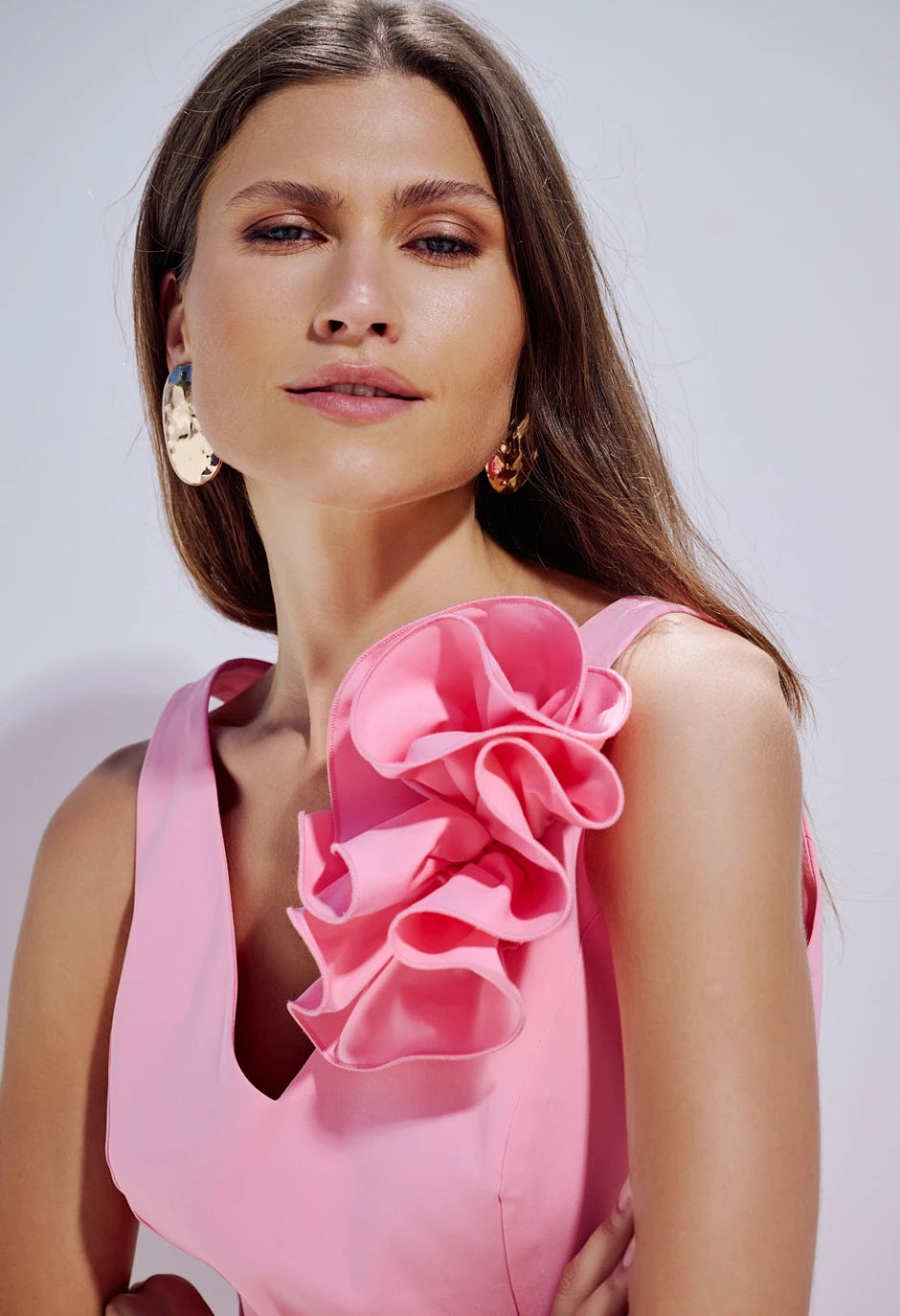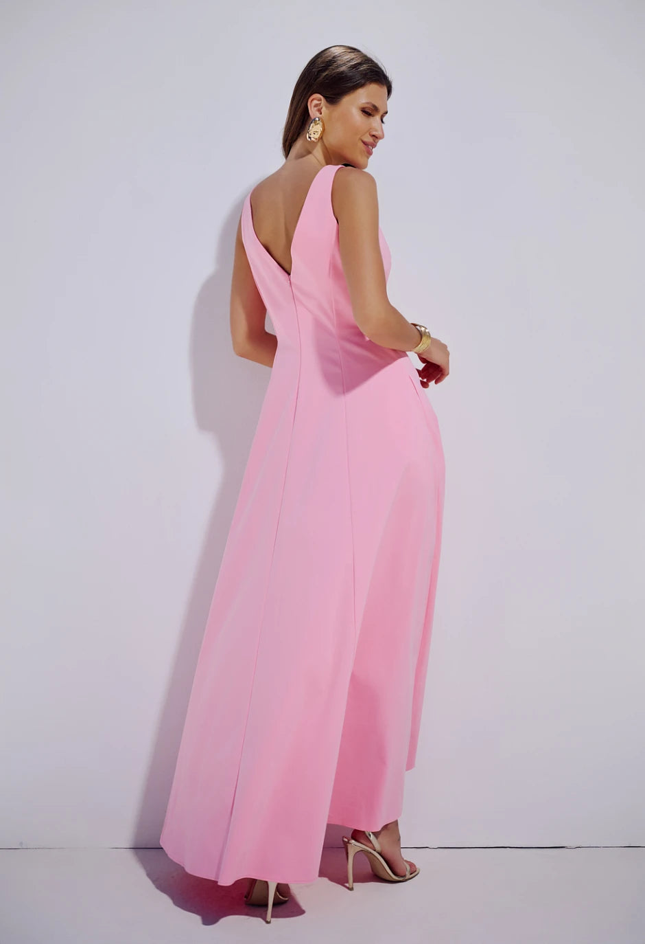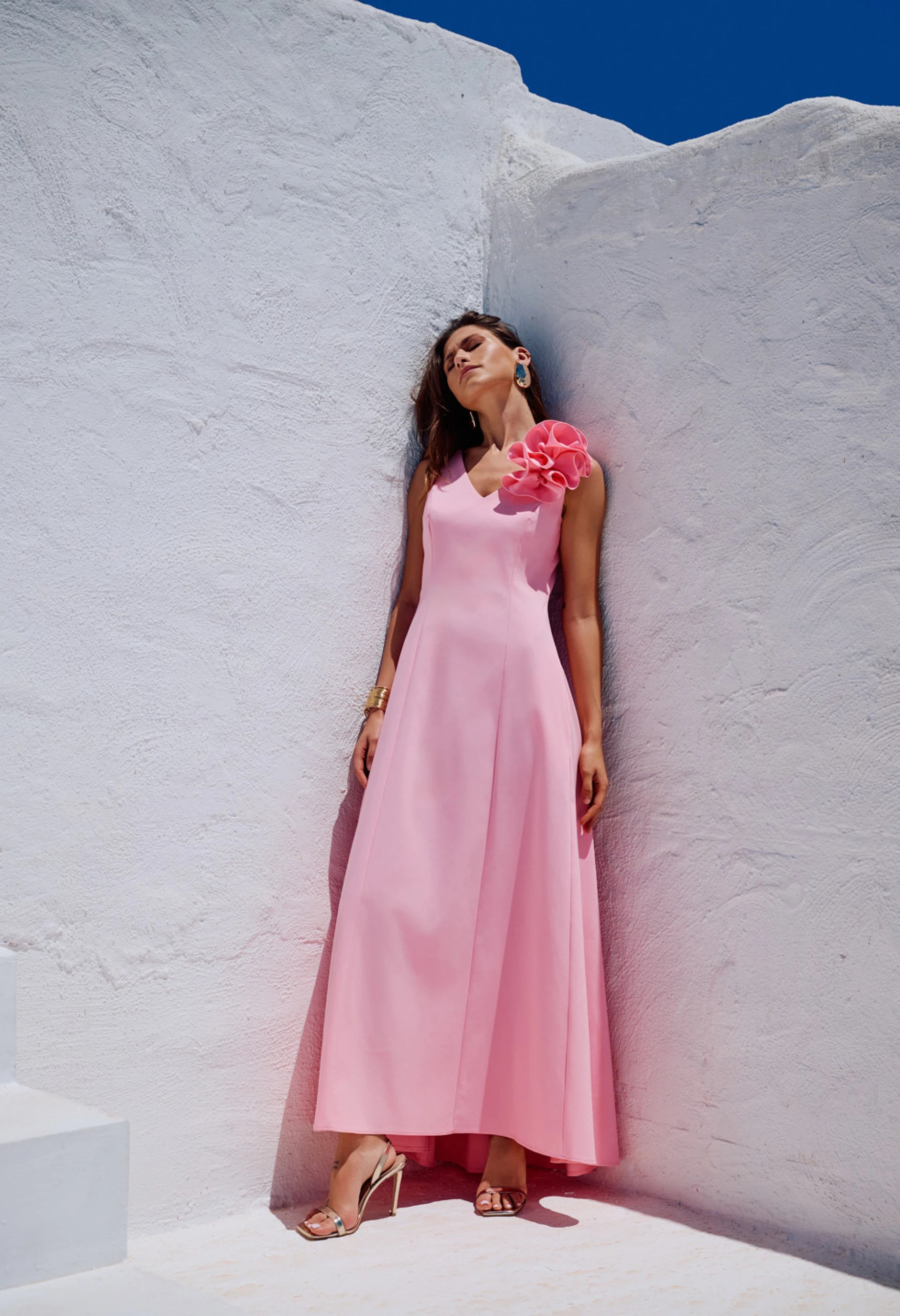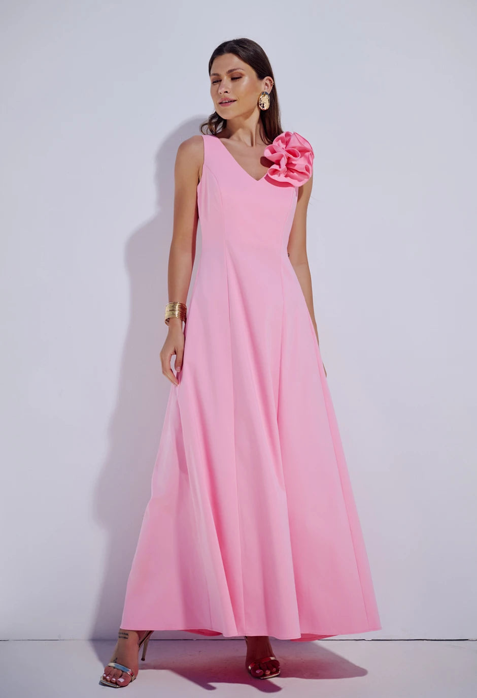 Μάξι φόρεμα σε ροζ απόχρωση και γραμμή Α, V ντεκολτέ και ανοιχτή πλάτη, λεπτομέρεια με τρισδιάστατο λουλούδι στον έναν ώμο, τσέπες στο πλάι και ασύμμετρο τελείωμα, κλείσιμο με φερμουάρ στο πίσω μέρος, κανονική εφαρμογή. Είναι ιδανικό για γάμους, βαφτίσεις, cocktail events.