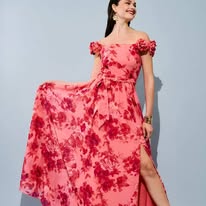 Φόρεμα σιφόν μάξι έξωμο με τριαντάφυλλα στις τιράντες φερμουάρ στο πλάι και ζώνη.