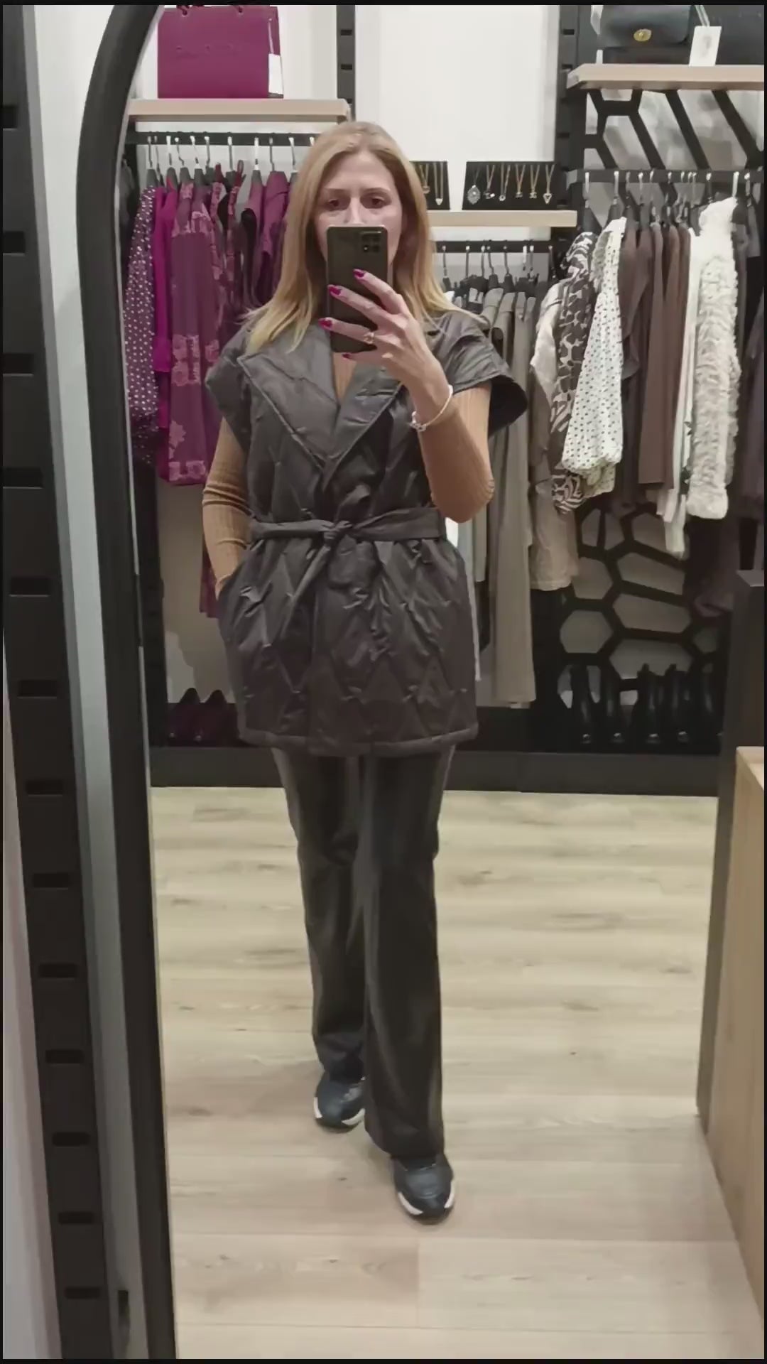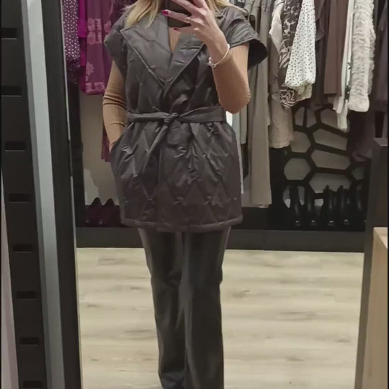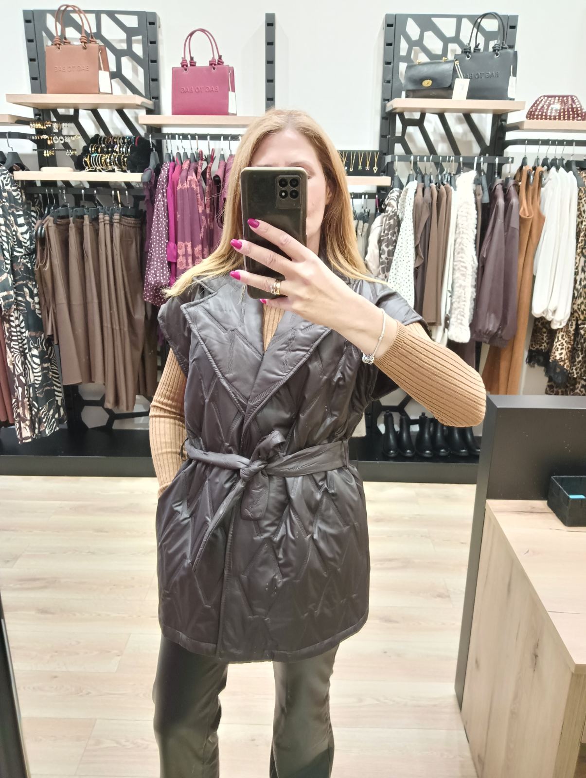 Κοντό αμάνικο καπιτονέ μπουφάν με μεγάλο γιακά και ζώνη στη μέση που αναδεικνύει τη σιλουέτα. Ιδανικό για layering πάνω από πουλόβερ ή φορέματα, σε αποχρώσεις μπορντό, καφέ, μαύρο και μπεζ. Άνετη εφαρμογή One Size.