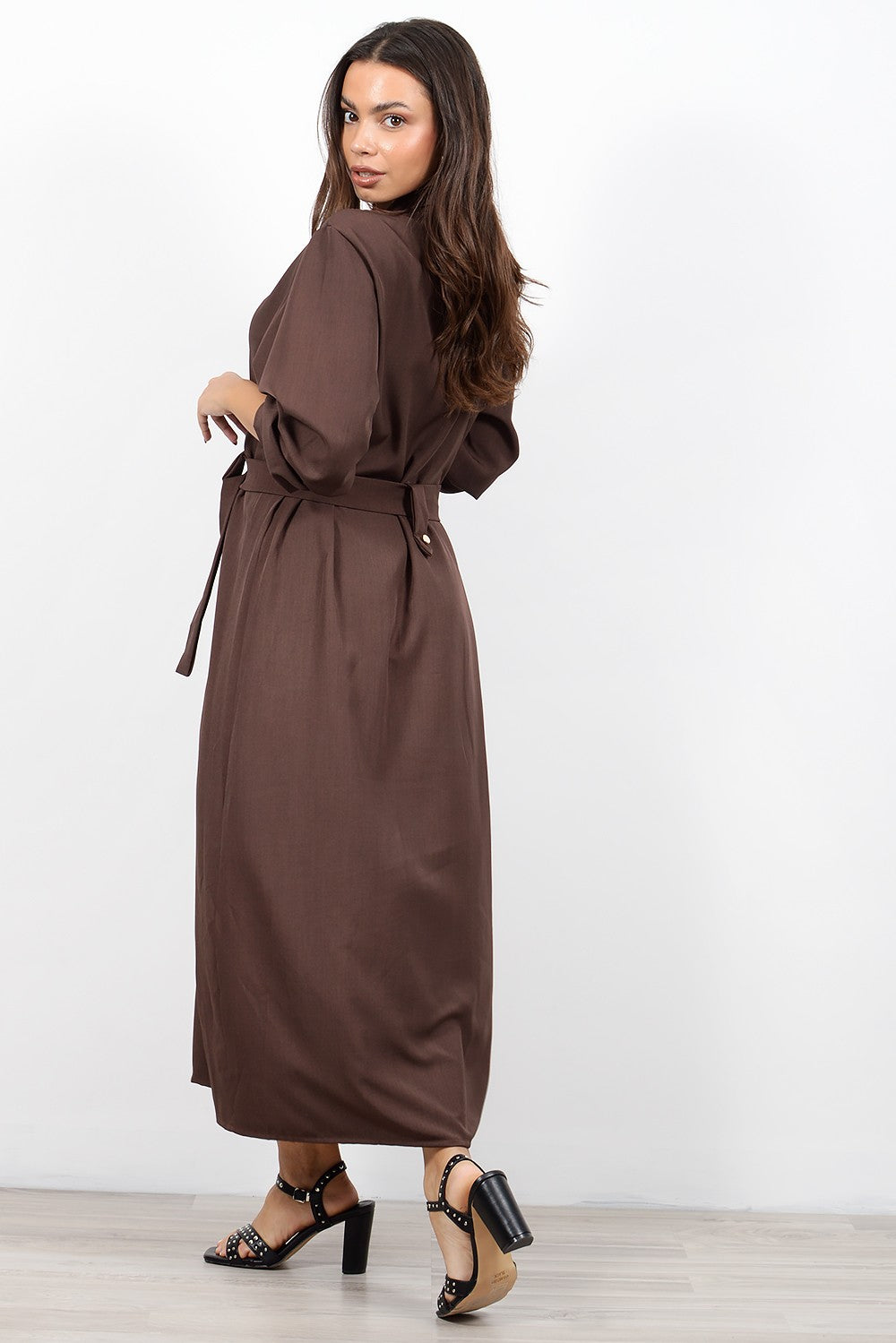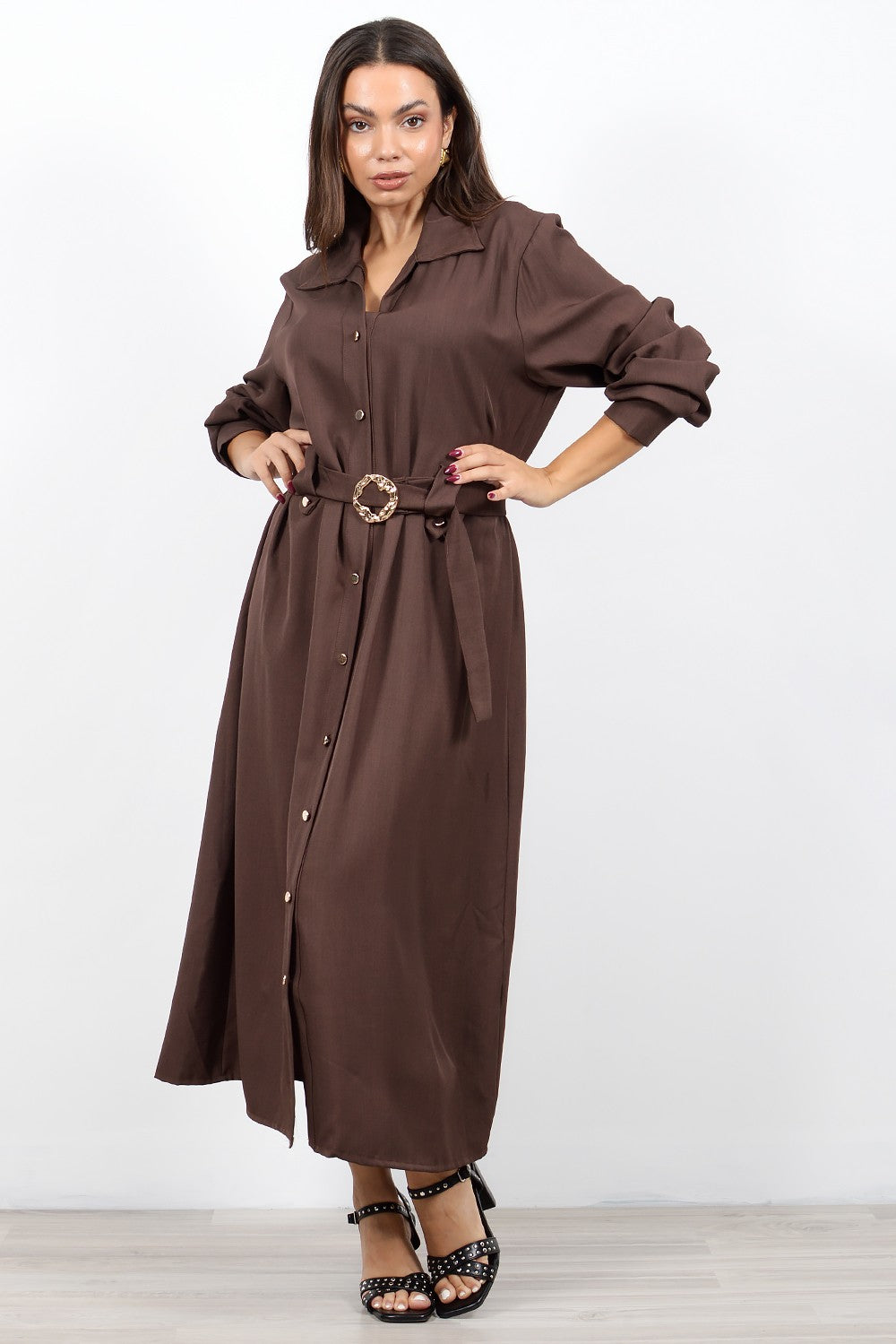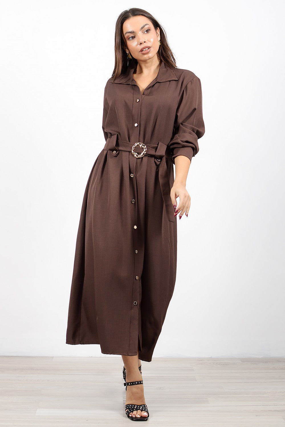 Κατασκευασμένο από ελαστικό ύφασμα υψηλής ποιότητας, εφαρμόζει διακριτικά στο σώμα, αγκαλιάζοντας τη σιλουέτα χωρίς να περιορίζει τις κινήσεις. Διαθέτει κουμπιά στο μπροστινό μέρος, που επιτρέπουν ρύθμιση στο άνοιγμα, και ζώνη στη μέση που τονίζει το σχήμα σας. Το καφέ χρώμα προσδίδει διαχρονική κομψότητα και ζεστασιά στη γκαρνταρόμπα σας.