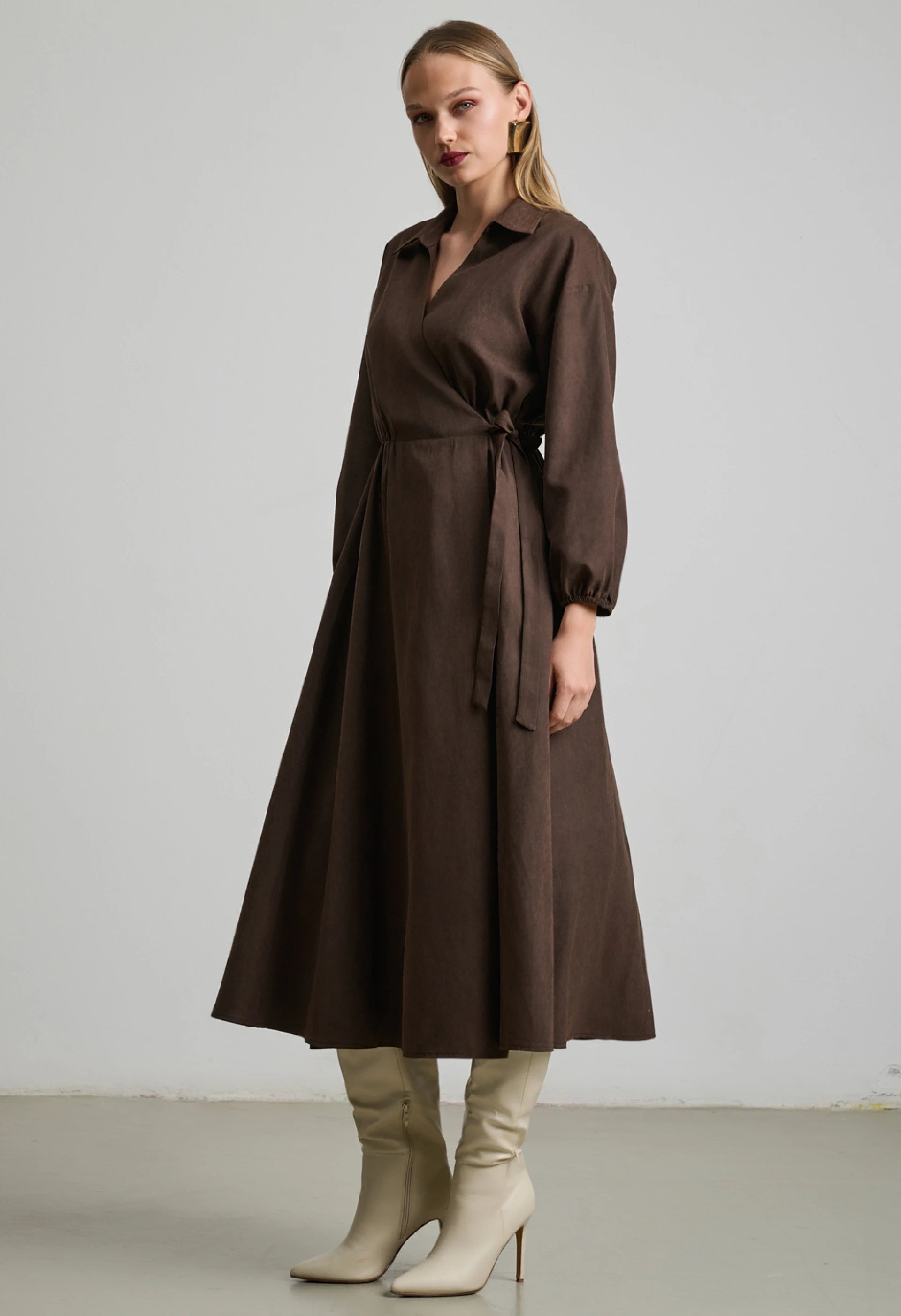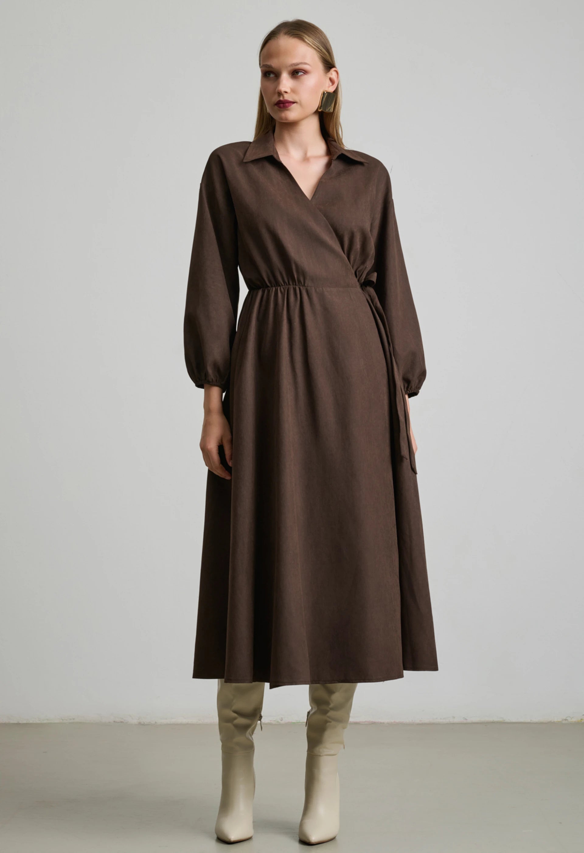 Midi φόρεμα με σταυρωτό (κρουαζέ) ντεκολτέ, φουσκωτά μακριά μανίκια και αποσπώμενη ζώνη. Ιδανικό για κομψές εμφανίσεις σε όλες τις ώρες της ημέρας.
