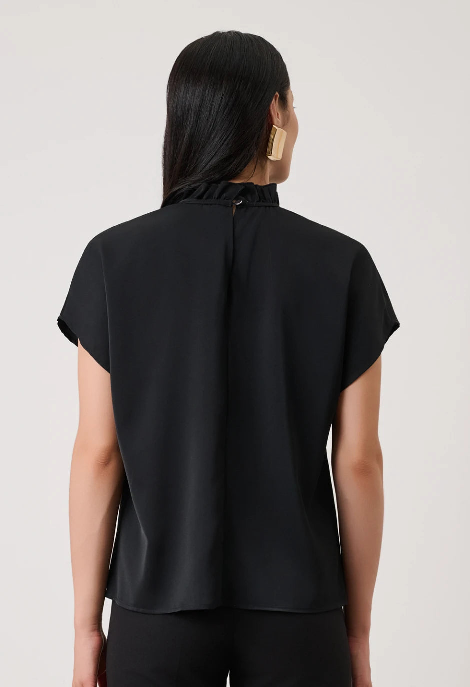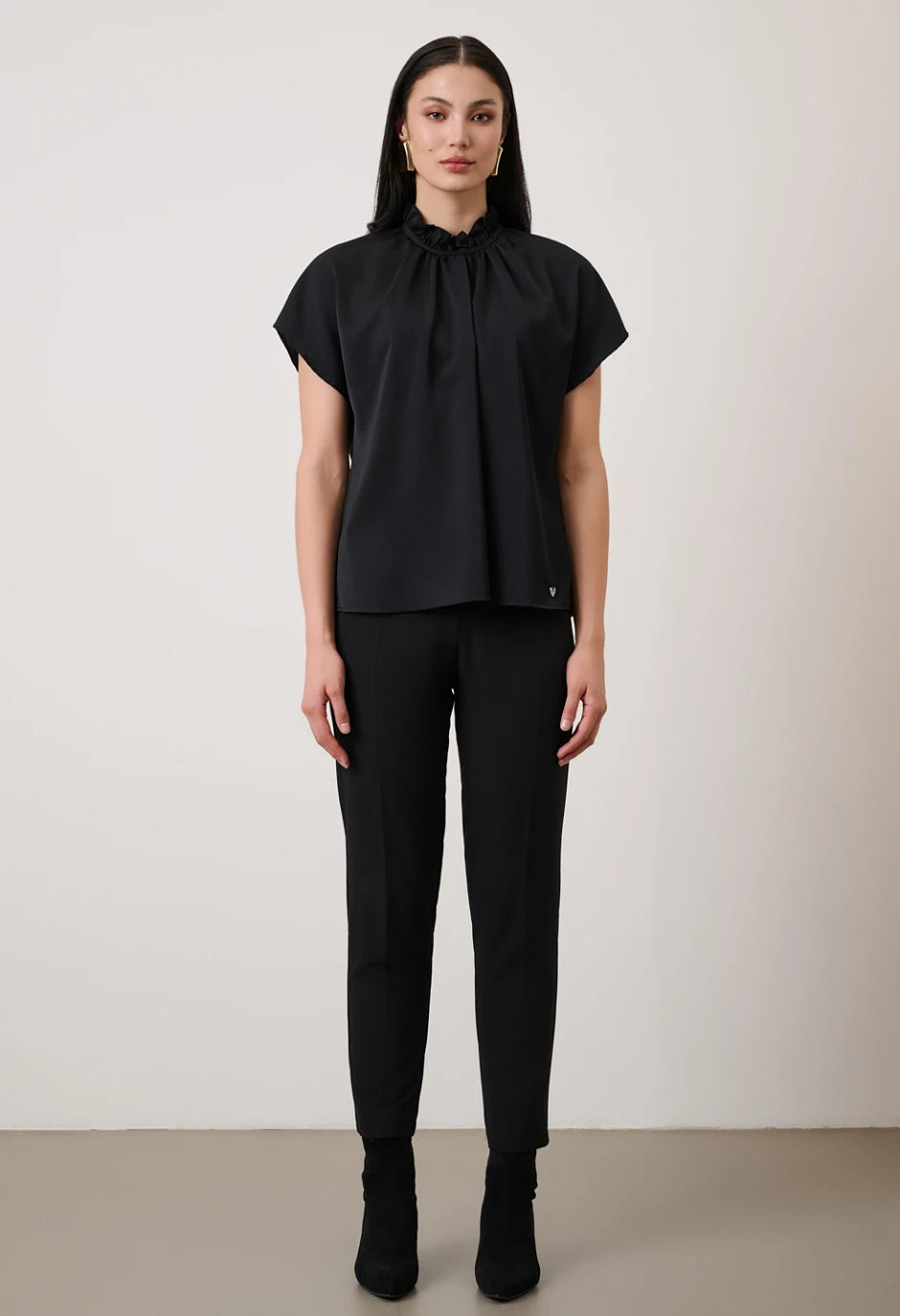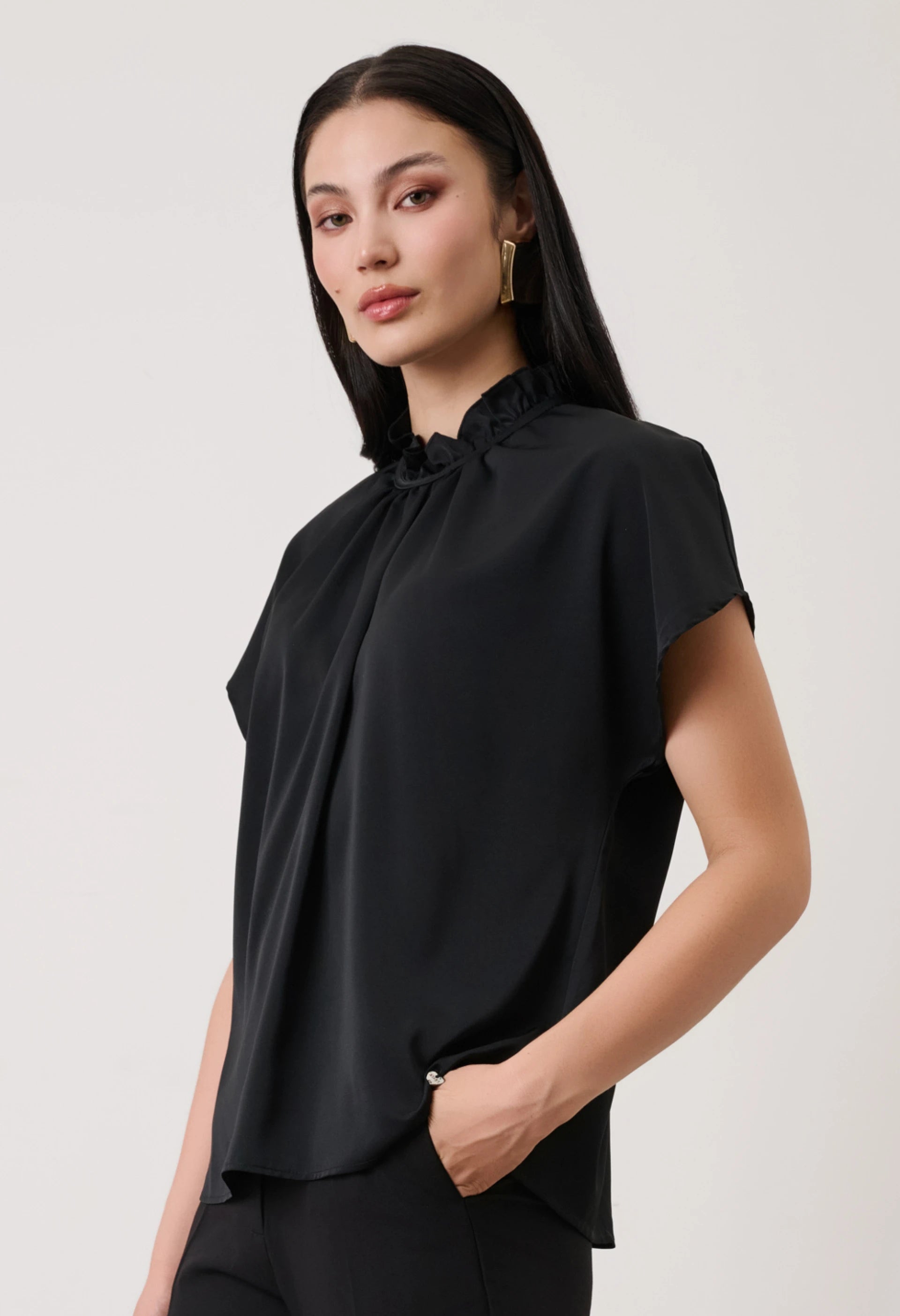 Αυτή η μαύρη μπλούζα από τη Desiree είναι ο ορισμός του θηλυκού, κομψού στυλ, ιδανική για το γραφείο ή για chic καθημερινές εμφανίσεις. Αποτελεί μία από τις πιο φρέσκες επιλογές στα γυναικεία ρούχα βέροια για τη νέα σεζόν. Design: Διαθέτει στρογγυλή λαιμόκοψη με διακριτικό βολάν γύρω από τον λαιμό και μοντέρνες σούρες στο επάνω μέρος. Τα κοντά μανίκια και η κανονική εφαρμογή την καθιστούν εξαιρετικά άνετη.