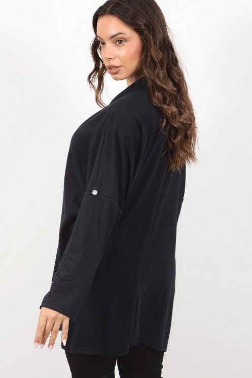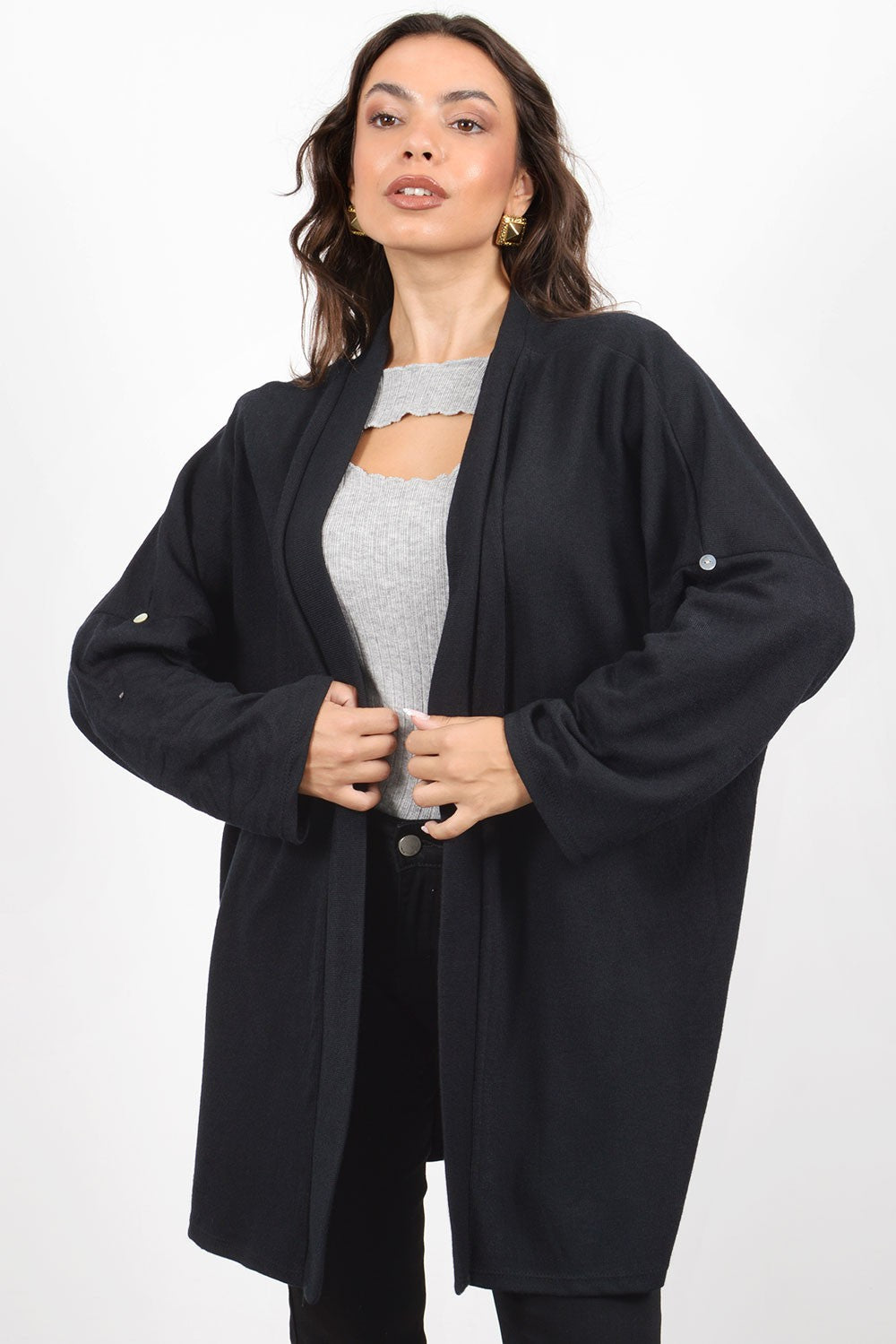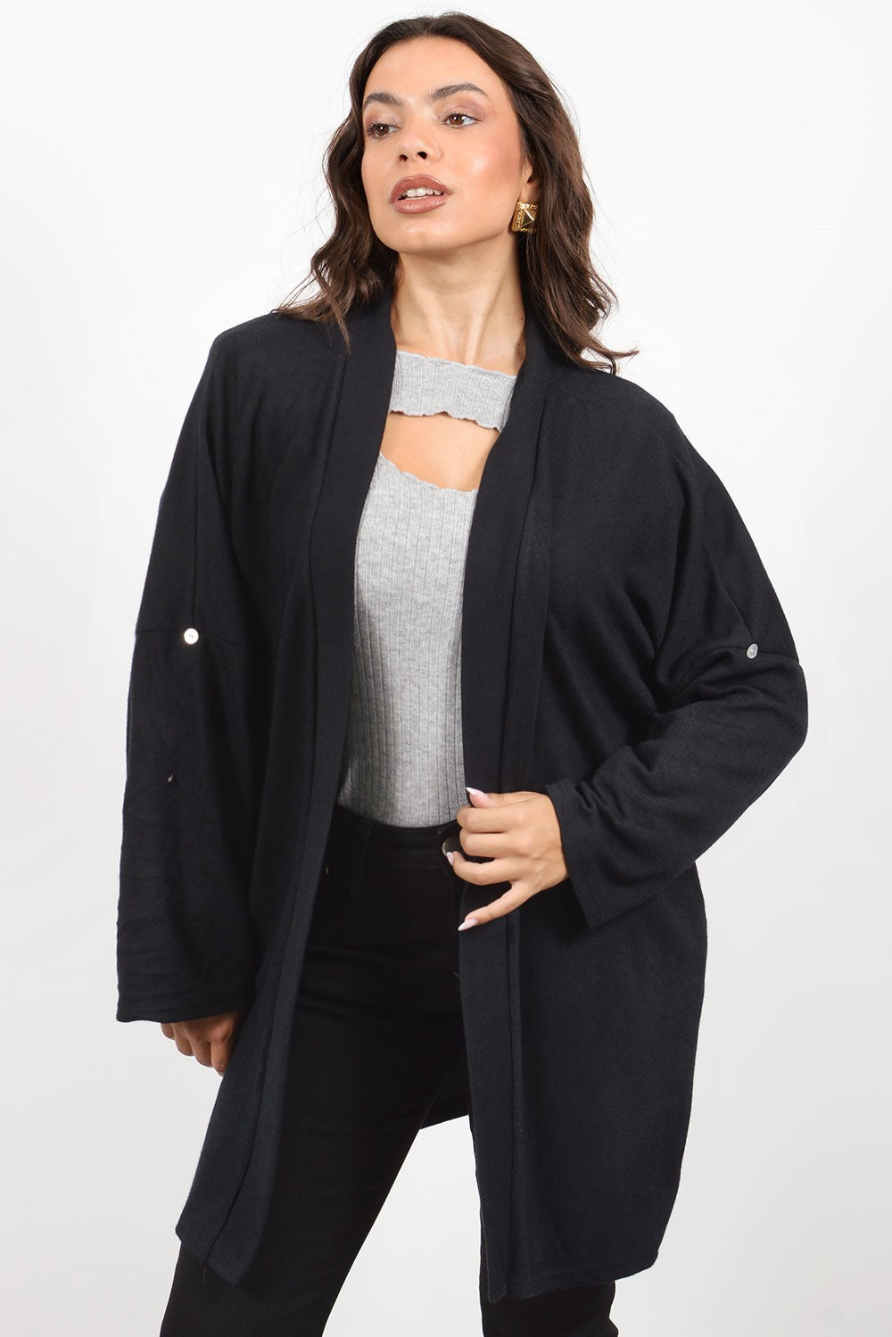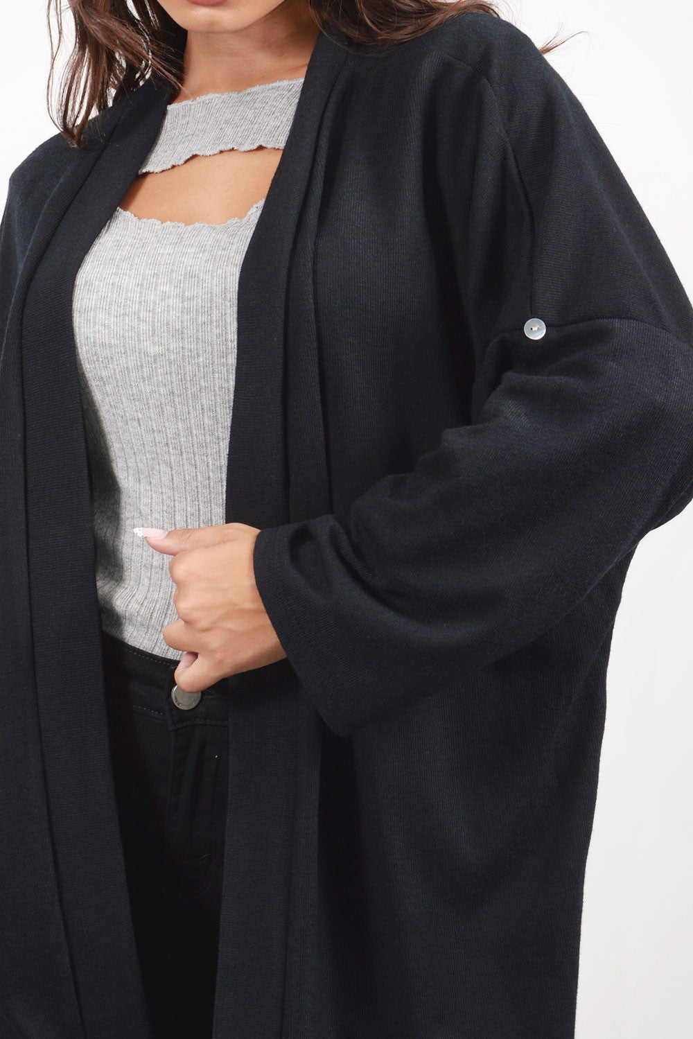 Πλεκτή ζακέτα σε μαύρο χρώμα, με φαρδιά oversized γραμμή και μεσαίο μήκος. Ιδανική για layering και κομψές casual εμφανίσεις όλες τις ώρες της ημέρας.