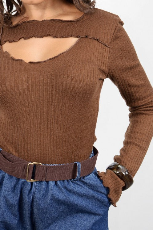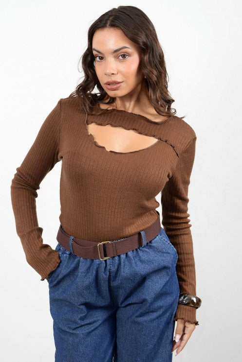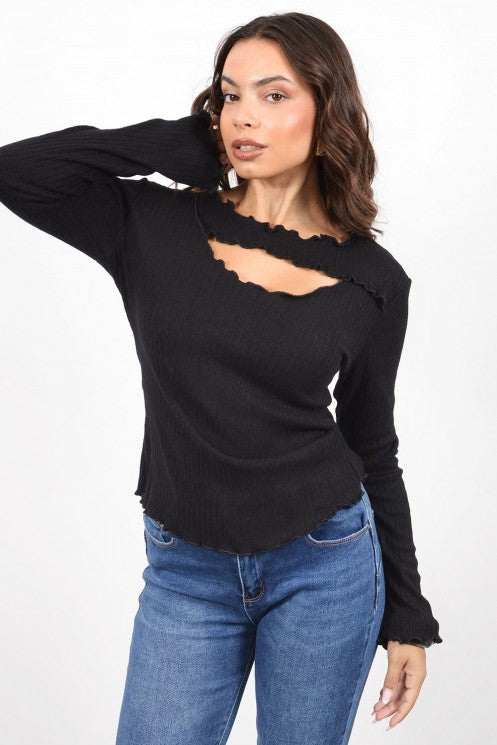 Η πλεκτή μπλούζα με ριμπ υφή συνδυάζει κομψότητα και μοντέρνο design. Το cut out άνοιγμα στο στήθος και το κυματιστό τελείωμα σε λαιμό & μανίκια την κάνουν ξεχωριστή. Εφαρμοστή γραμμή που αγκαλιάζει το σώμα – ιδανική για σικάτες εμφανίσεις μέρα & βράδυ.